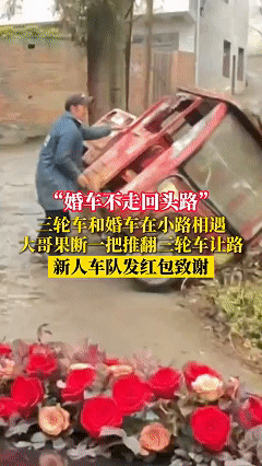 太暖心了!近日贵州毕节,男子今天结婚,迎娶新娘的路上一切顺利,可在去酒店的路上却遇到了难事,一位大哥把三轮车停在路边正好挡住了出路,正当男子一行人犯难时,大哥的举动却出乎了所有人的预料,为了给新郎新娘腾出路来,大哥竟直接将三轮车推翻了。 原来,当地有个习俗,婚车不走回头路,如果婚车在路上掉头了就意味着以后小两口的婚姻不幸福,所以当路上看见这两三轮车时所有人都犯了难,这里是乡村的小路,不从前面走就只能掉头,要么就得等大哥干完活。 这时正在路边搬玉米杆的大哥也发现了婚车,看到婚车停在眼前进退两难,大哥瞬间就全明白了,可大哥的反应却让人意外,为了能快速把路让开,大哥就直接把车掀翻了,完事后大哥冲着婚车摆了摆手,示意大家快速通过。 这一幕把所有人都感动坏了,这份宁愿自己受累也不愿意给别人添麻烦的素质太触动人了,而新郎也不差事,经过大哥身边时专门给大哥包了个大红包,感谢大哥的奉献。 婚车司机将这段经历拍下来发到了网上,瞬间引起了网友们的热议。 有的网友说:这就是农民最朴实的善良,给大哥点赞。 还有的网友说:这一让,直接让出了新高度。 也有的网友说:红白喜事 一般都会通融的,一个人一辈子也就这么两天的风光时刻。 其实从视频中能看到,大哥之所以要把车掀翻,不仅仅是为了快速让出一条路,更是因为这辆三轮车已经坏了,前轮已经干瘪没气了,可能大哥在骑过来时就发生的小意外,所以大哥才选择直接将车掀翻而不是倒退。 也正像网友说的,这一让让出了新高度,看大哥的情况日子肯定不算宽裕,但大哥没有像网上那些婚闹一样故意堵路找事,而是用自己的淳朴去帮助身边每一个陌生人,这份质朴和善良才是大哥一生最大的财富和宝藏。