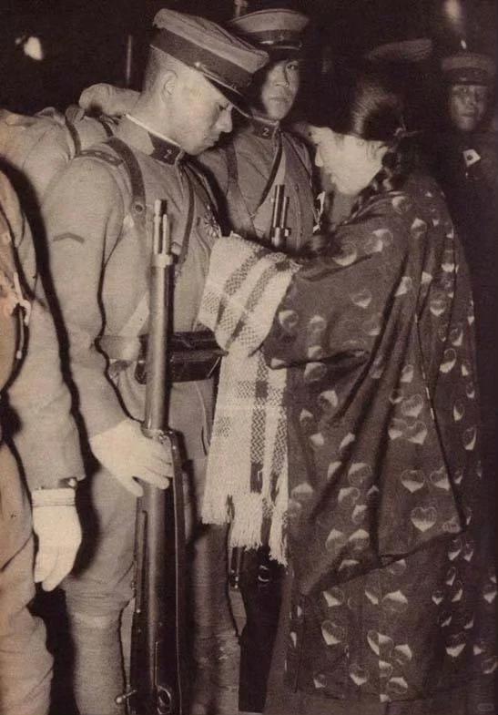 这张老照片,定格了日本军国主义扩张时期极具煽动性的一幕。身着传统和服的日本女子正将一条“千人针”布条系在即将开赴我国东北的鬼子士兵身上。 这条布条由上千名日本女性每人缝制一针而成,在军国主义宣传中被渲染为能“护身避弹”的护身符。这种仪式看似是温情的送别,实则是日本政府煽动民间战争狂热、裹挟普通民众参与侵略的手段。它将残酷的侵略行为美化成“为国尽忠”的“正义之举”,让普通女性也成为战争机器的一部分,为日军的暴行提供精神支持。