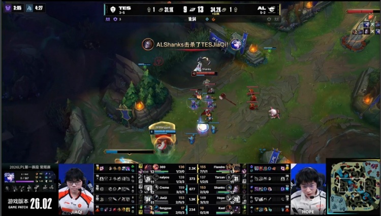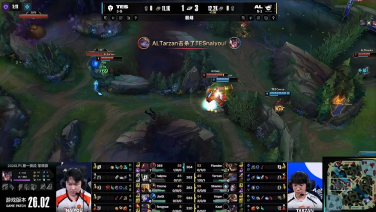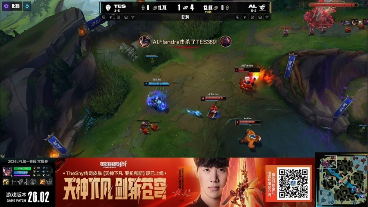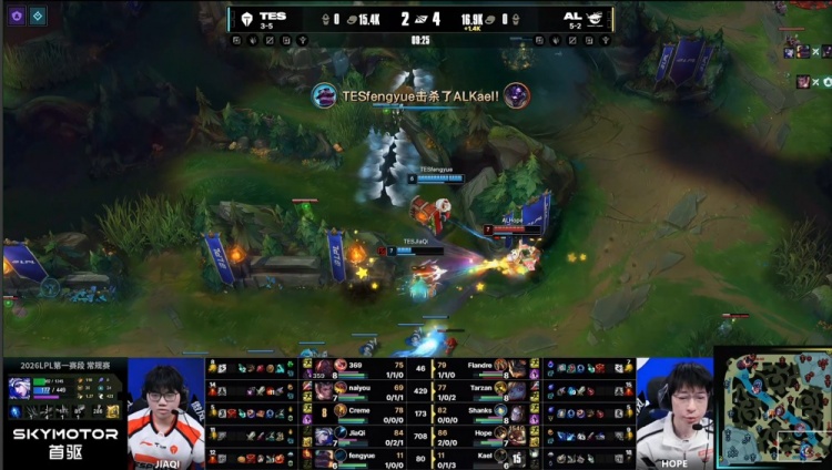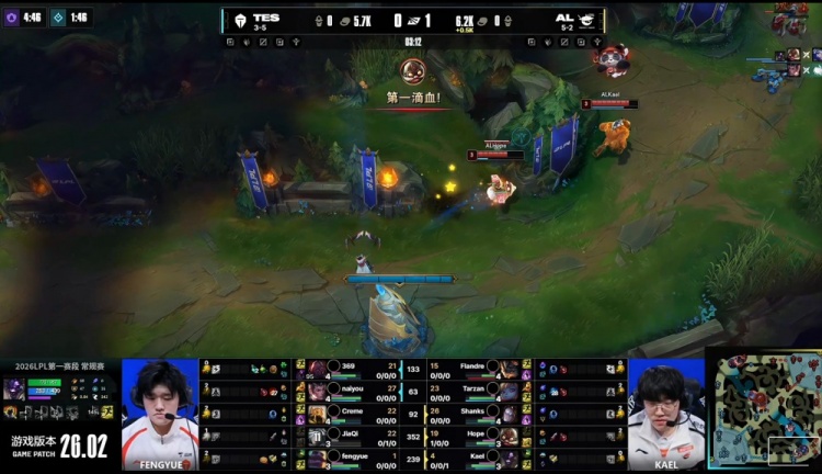 [26:48]AL入侵TES野区,王杰飞机轻松双杀,AL打出0换5团灭TES,经济优势来到1w4k。