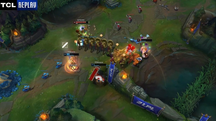[9:25]AL双人组下路越塔推线,JiaQi艾希追击Kael牛头不断开刮,到三角草fengyue布隆闪现开大吃掉人头,王杰飞机反手1打2也送fengyue布隆终结,Tarzan波比打完小龙来下击杀JiaQi艾希,TES打出1换2。老9上路再送一个人头。