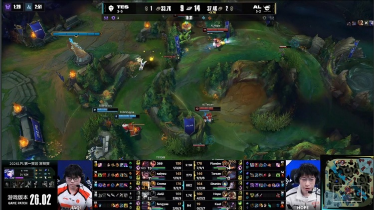 [18:18]野区团战,Tarzan波比大锤锤飞TES野辅,JiaQi孤立无援被杀,AL经济领先4k。