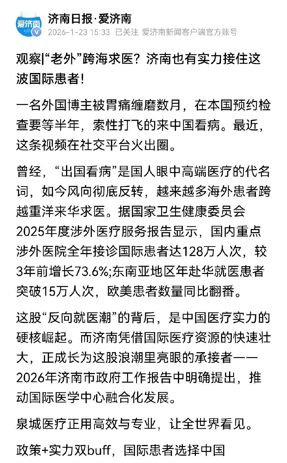 济南要承接外国人医疗了。要承接外国人医疗,必须做到两点,以保障国人医疗。 最