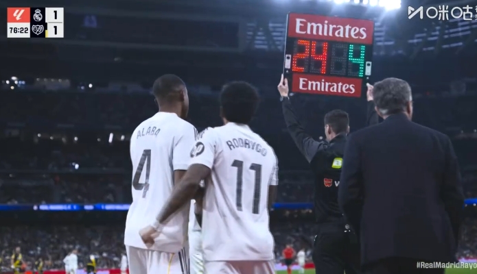 直播吧02月01日讯皇马vs巴列卡诺第78分钟,阿韦洛亚再次换人调整,阿拉巴换下赫伊森,罗德里戈换下居莱尔!