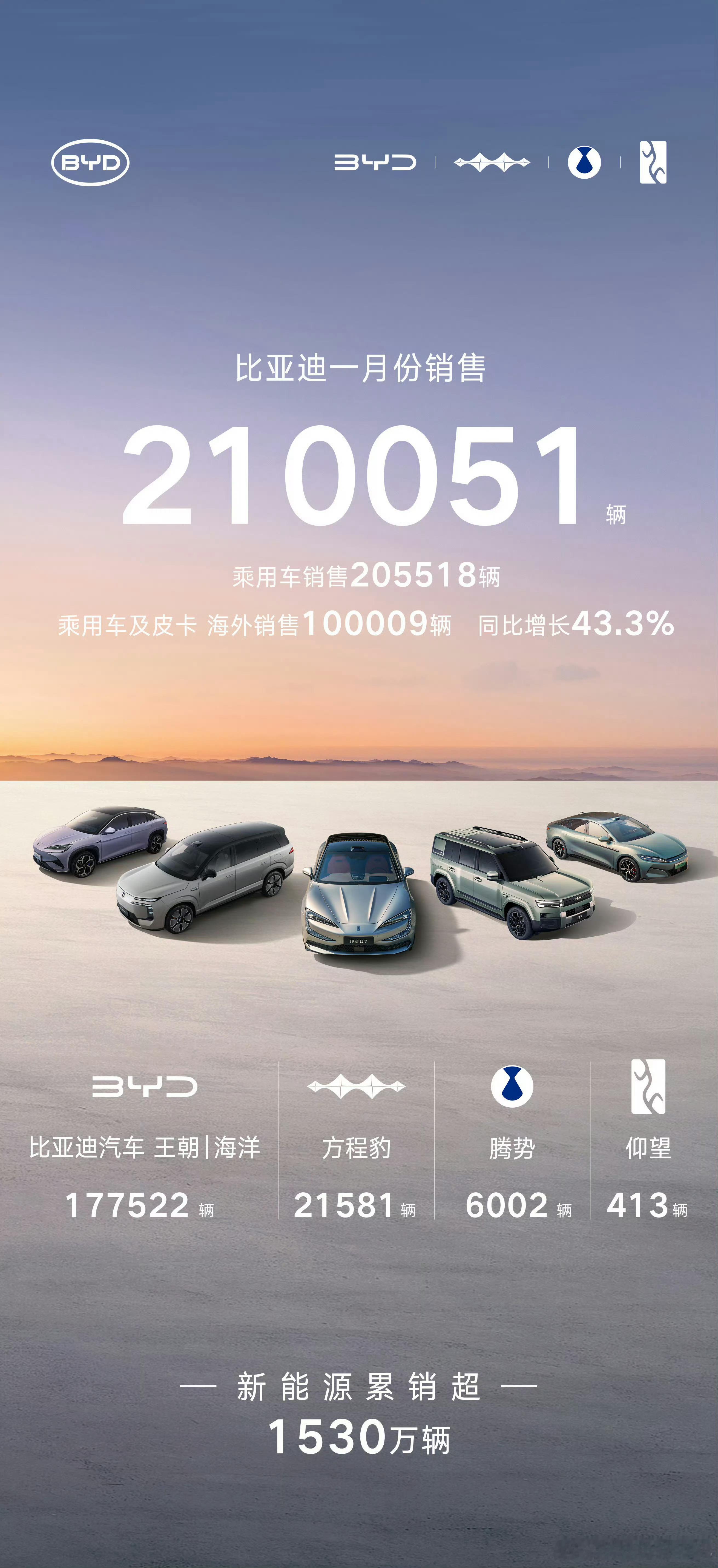 然后我再额外补充三点:❶1月,冬季,天气客观因素影响。❷今年的1月份,也是新能源购置税半退坡的首月,那些 all in 新能源的车企,受到的影响肯定会大一些,这很好理解吧?而在迪子的销量构成里,也是100% 的新能源,没有任何一台纯燃油车,这在国内大厂里,仅此一家。❸每年的首月或次月,通常都是迪子表现最虚弱的时候,原因嘛,很简单:一是临近过年,油车的销量会有一波回弹,而迪子吃不到这个红利;二是,迪子通常把战略反攻期放在年后,而且大概率是最早发起的那个,所以,别急。