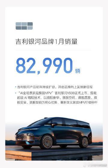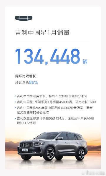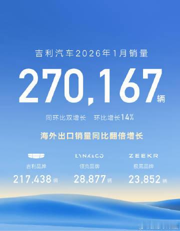 吉利汽车1月销量27万辆同环比双增长,新能源销量12.4万辆,海外出口销量同比翻倍增长!汽场全开吉利汽车1月汽车总销量为27.02万部吉利汽车1月销量27万辆吉利