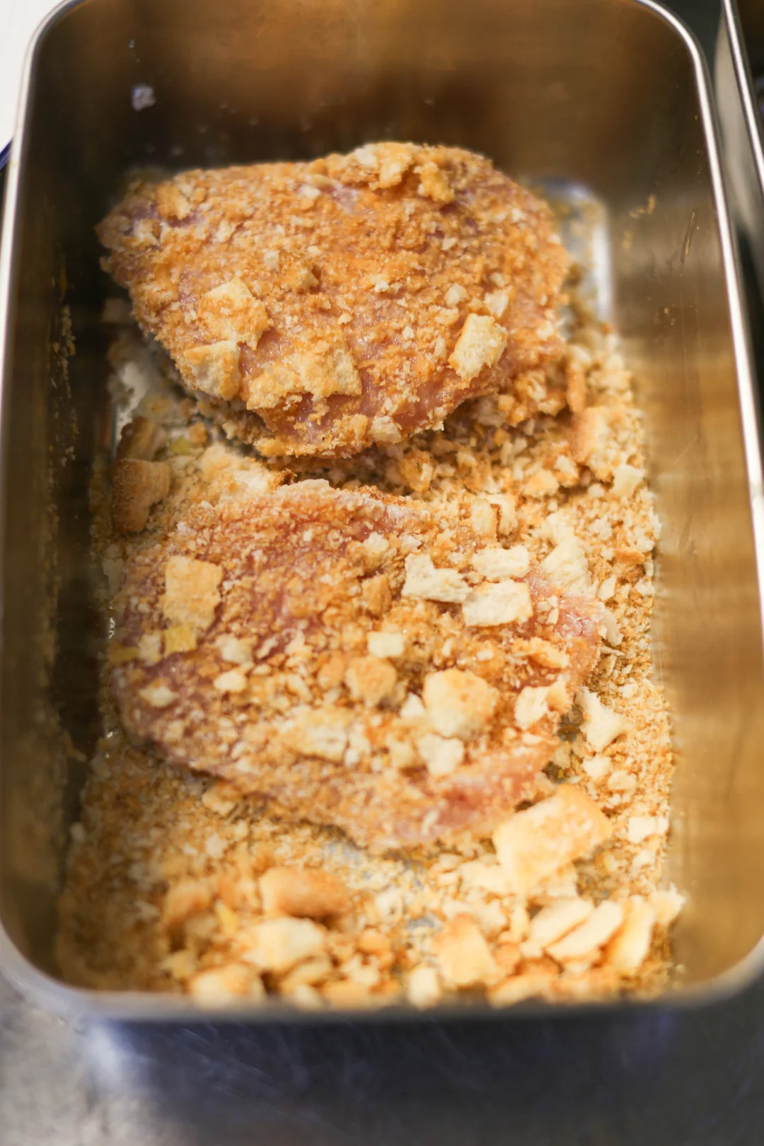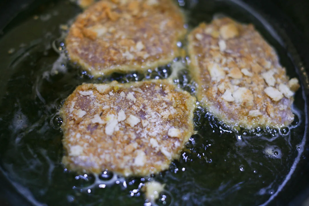 猪排: 1:超市买来新鲜现成的猪排,可以用刀背把两面都拍松散,撒上食盐和黑胡椒,腌制10分钟。 2:准备2个全蛋,打散。适量面粉、适量面包糠。 3:腌制好的猪排先沾上一层面粉,放入鸡蛋液中,左右两面沾上面包糠。 4:平底锅中放入适量的油,大约深度4厘米左右即可,两面煎炸金黄即可。 小贴士 ①、汉堡的内馅可以换成鳕鱼堡或者鸡排都可以。 ②、汉堡酱的调制,可以用沙拉酱和番茄酱。如果想要味道浓郁一点,可以用芥末籽酱:沙拉酱:原味酸奶=2:2:1的比例,将这些材料放入碗中混合,再加入适量欧芹碎即可。 面包糠可以买现成的,也可以用吐司面包剩下的边用破碎机轻微打碎。图文中省去了这个步骤,直接用手捏了几下,看上去不是很细腻。