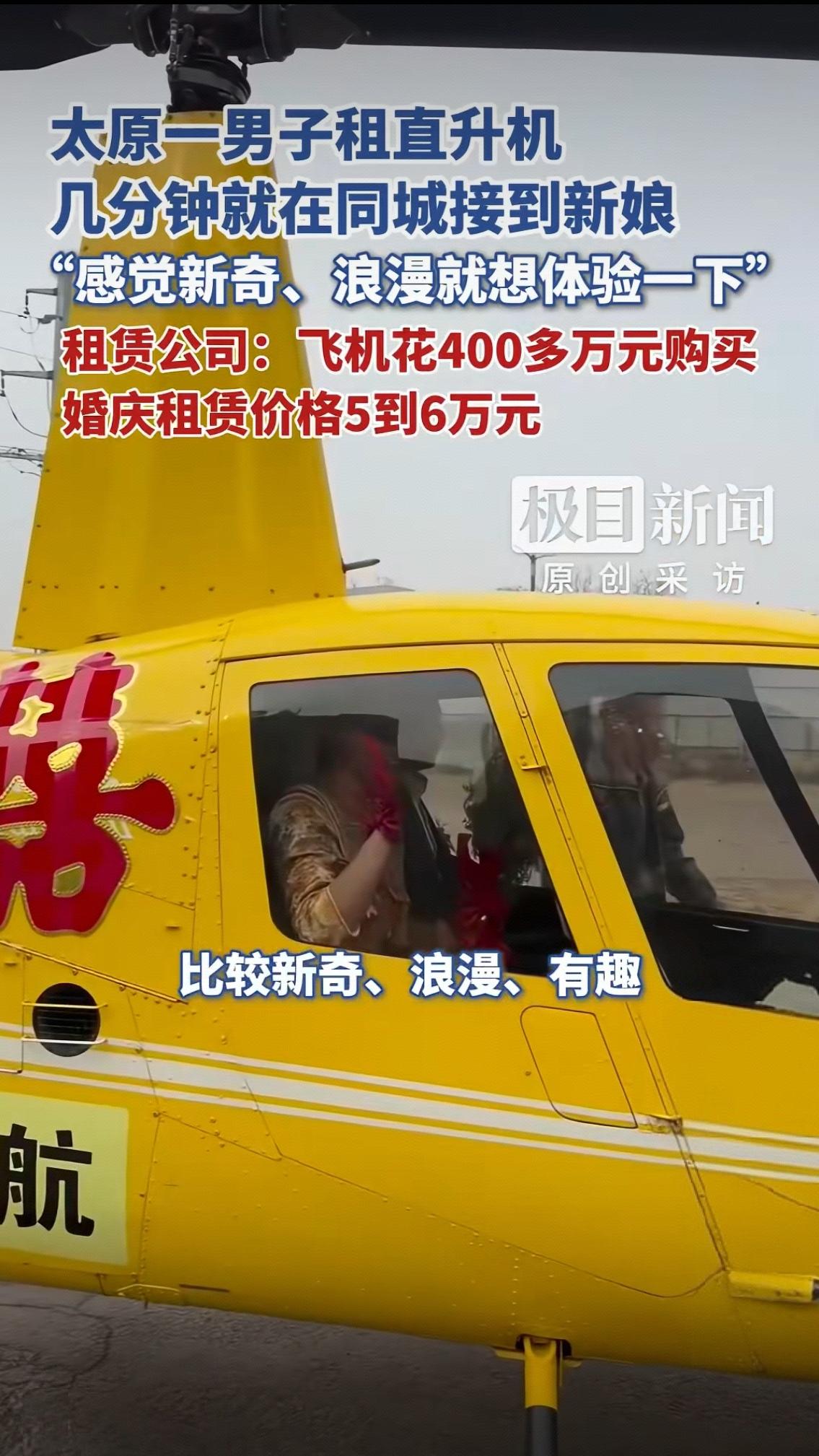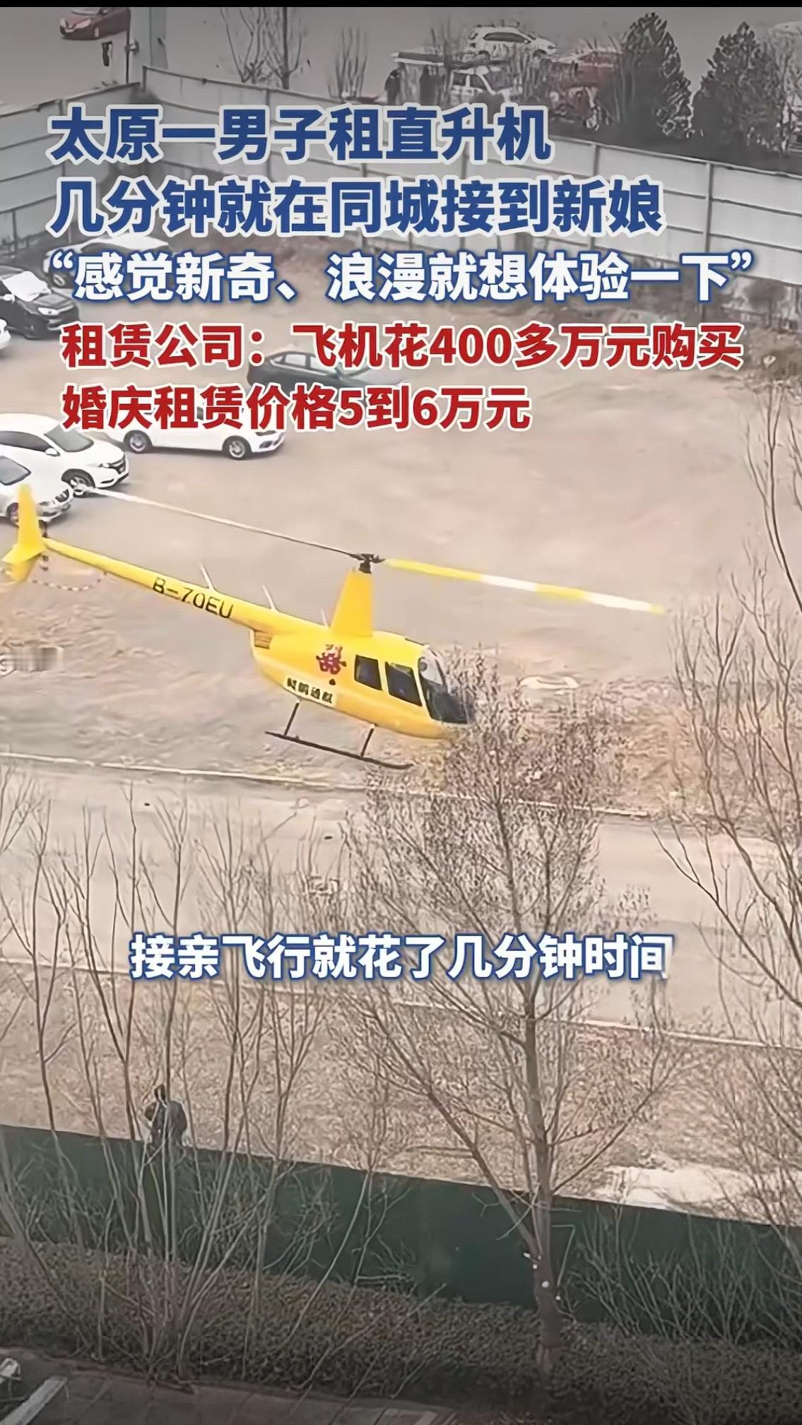 “新鲜”太原清徐县的晒谷场,从未如此热闹过。1月29日上午,一阵轰鸣划破村庄的宁静,一架贴着大红“囍”字的直升机盘旋而下,稳稳停在空地上。蹲墙根的大爷惊掉了旱烟杆,大妈们扒着墙头扯着嗓子吆喝,小媳妇们举着手机往前冲,连隔壁村的人都骑着电动车赶来看稀奇,场面比赶庙会还火爆——这不是电影情节,是新郎杜先生给新娘准备的接亲惊喜。 “就是想给她个不一样的回忆!”面对镜头,杜先生笑得憨厚。谁能想到,这场仅持续5分钟的空中旅程,背后藏着不少门道:租用的罗宾逊R44直升机市场价400多万,相当于一线城市一套豪宅,巡航时速210公里,十几公里的路程比堵在婚车长龙里舒坦一万倍。租赁公司透露,5到6万元的租金看着贵,实则包含了航油、机组工资和空管报批等所有成本,而且想租还得提前两个月预约,咨询电话早就被打爆了。 消息一上网,评论区直接炸成了“辩论场”。支持派拍案叫绝:“比起几十万彩礼、豪车车队,5万换一辈子忘不掉的浪漫,值!”“花自己的钱搞创意,比攀比炫富强多了,新娘的笑容就是最好证明”;反对派却直言不解:“5分钟烧掉普通人一年工资,够交孩子学费、添全屋家电了,纯粹拿钱打水漂”“结婚是过日子,不是演给别人看,这铺张浪费的风气不能涨”;还有吃瓜网友脑洞大开:“下一步是不是租火箭?这婚俗卷到天上去了”。 其实吵来吵去,核心无非是“婚礼该怎么过”。老一辈结婚,自行车接亲、煤油灯闹洞房,图的是热闹实在;后来小轿车车队成了标配,比拼的是排场;如今年轻人玩起直升机接亲、旅拍婚礼,追求的是个性与专属记忆。从二八自行车到直冲云霄的直升机,变的是接亲形式,不变的是新人对未来的期盼。 但争议的关键从来不是“花不花钱”,而是“初心是什么”。如果只是为了跟风攀比,把婚礼变成炫富秀场,再贵的形式也索然无味;可如果是两个人真心想留下独特回忆,就像杜先生说的“她趴在舷窗边笑得眼泪都出来了”,这份情感价值便无可替代。更何况,正规的直升机接亲并非随心所欲,提前报备航线、确认安全场地,每一步都透着对仪式的敬畏。 说到底,婚礼没有标准答案。有人偏爱温馨家宴,有人喜欢新潮创意,只要不违背公序良俗、不忽视安全,花钱与否、形式如何,都是别人的选择。但我们真正该讨论的是:当婚礼越来越卷,我们是否还能守住“爱”的核心?5万租直升机接亲,你觉得是浪漫还是浪费?评论区聊聊你的看法!