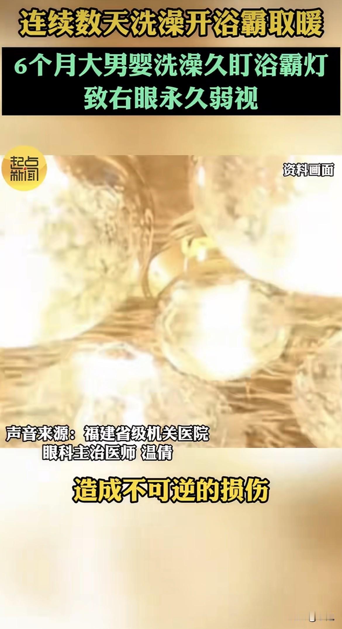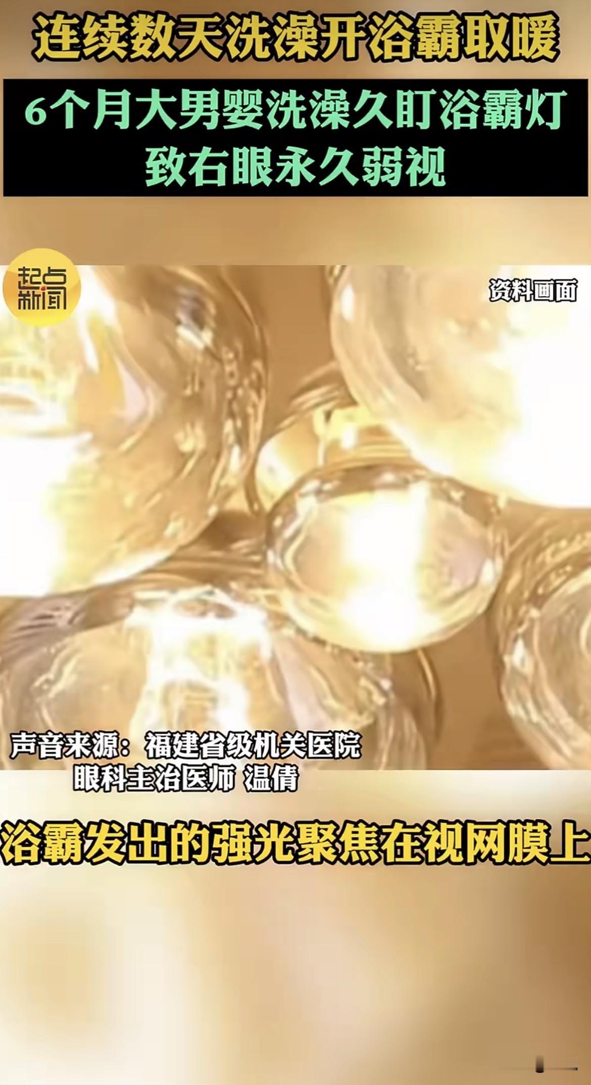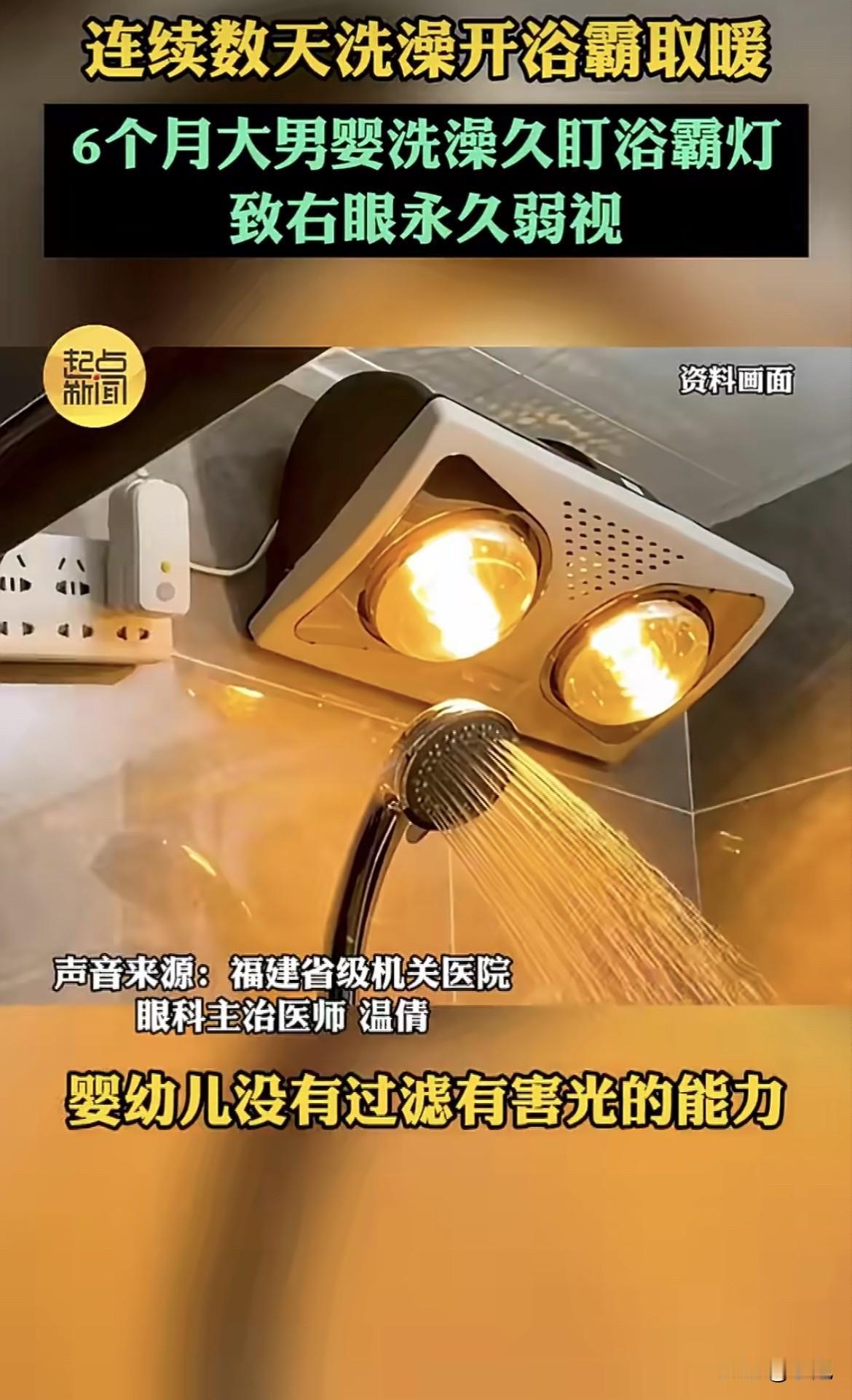 警惕!福建一位妈妈给6个月大的儿子洗澡,怕孩子冷,打开了浴霸取暖。几天后,孩子开始怕光、不停揉眼睛、流眼泪。送到医院一查,全家人都懵了——孩子的右眼视网膜被灼伤,确诊为终身弱视。伤眼的,就是头顶上那盏看着温暖的浴霸灯。 这宝宝洗澡时,总会不自觉地朝最亮的浴霸灯看。妈妈只觉得开了浴霸孩子不会感冒,完全没想到那团暖黄的光,会像一把“光刀”一样伤到孩子眼底。 孩子的眼睛,和大人看到的根本不是同一个世界。厦门眼科中心的专家解释,浴霸等光源发出的光里含有大量高能量蓝光。这种蓝光能穿透眼睛的屏障,直接到达视网膜最核心的黄斑区。问题就在于,小婴儿的眼睛太“干净”了——他们的晶状体非常清澈,无法像成人晶状体那样过滤掉有害的蓝光。有数据显示,大约70%至80%的蓝光可以直达2岁以下婴幼儿的视网膜,而这个比例在成年人只有20%左右。强光进入他们眼底,几乎畅通无阻。 伤害是无声且永久的。视网膜上的黄斑区,是负责我们看清细节和颜色的最关键部位,直到孩子4岁左右才能发育完全。浴霸的强光聚焦在这里,就像用放大镜聚光烧纸,会加速视网膜细胞的氧化损伤。这种损伤是累积性的,而且神经细胞一旦被灼伤就无法再生。孩子不会说话,等家长察觉到怕光、揉眼这些异常时,伤害往往已经无法逆转了。 给婴幼儿洗澡取暖,安全的方法其实很简单:提前预热,避开直射。最好的办法是在孩子进浴室前,提前几分钟打开浴霸升温,等温度合适了就关掉,再抱孩子进去洗。如果实在需要开着,一定避免让孩子仰面朝上直对光源,可以调整孩子姿势或浴霸角度,确保光线不直射眼睛。 我们总觉得强光刺眼自己会躲,却忘了怀里的宝宝,正用那双清澈见底、毫无防备的眼睛,好奇地凝望着所有发光的东西。一次疏忽,可能换来的是一辈子视界的模糊。 你有没有想过,洗澡时头顶那盏灯,可能藏着这样的风险?
