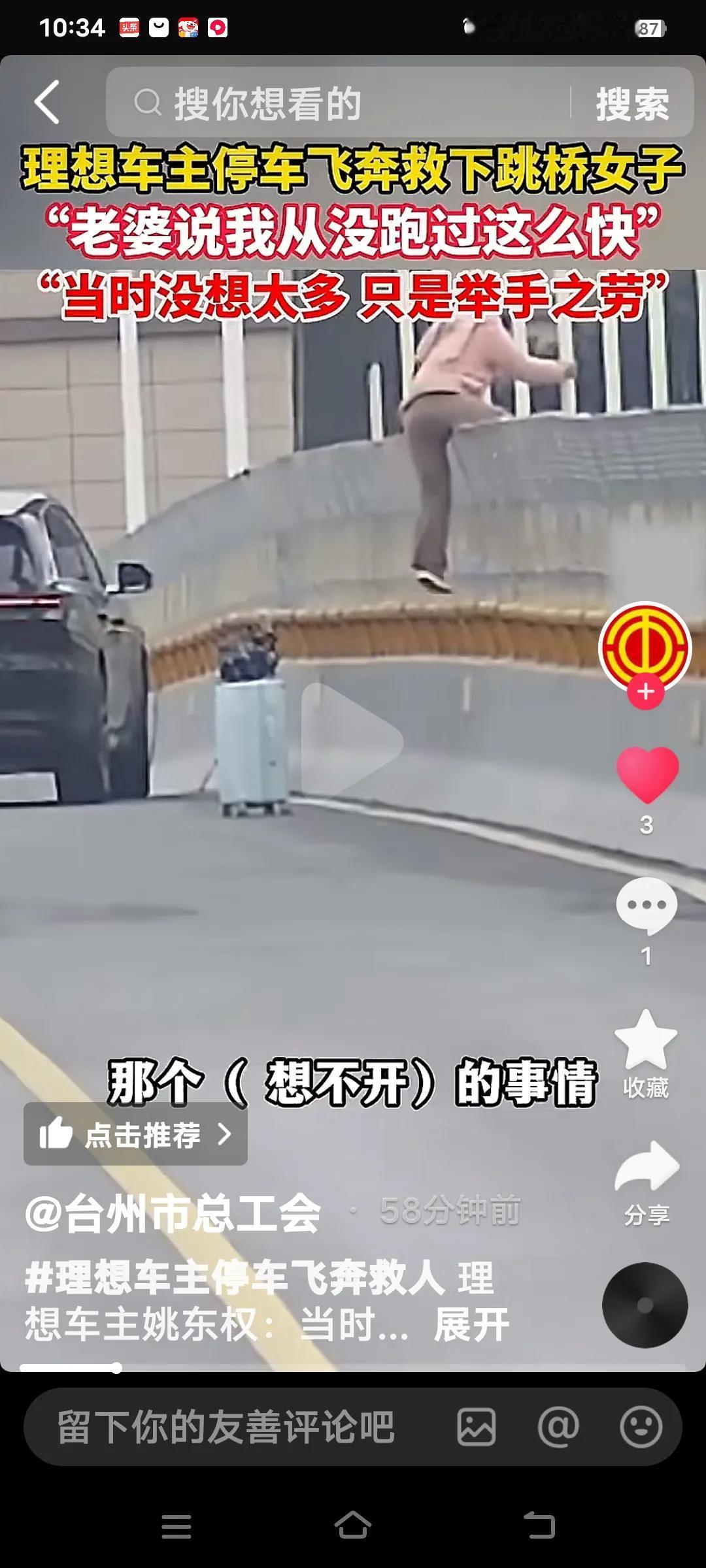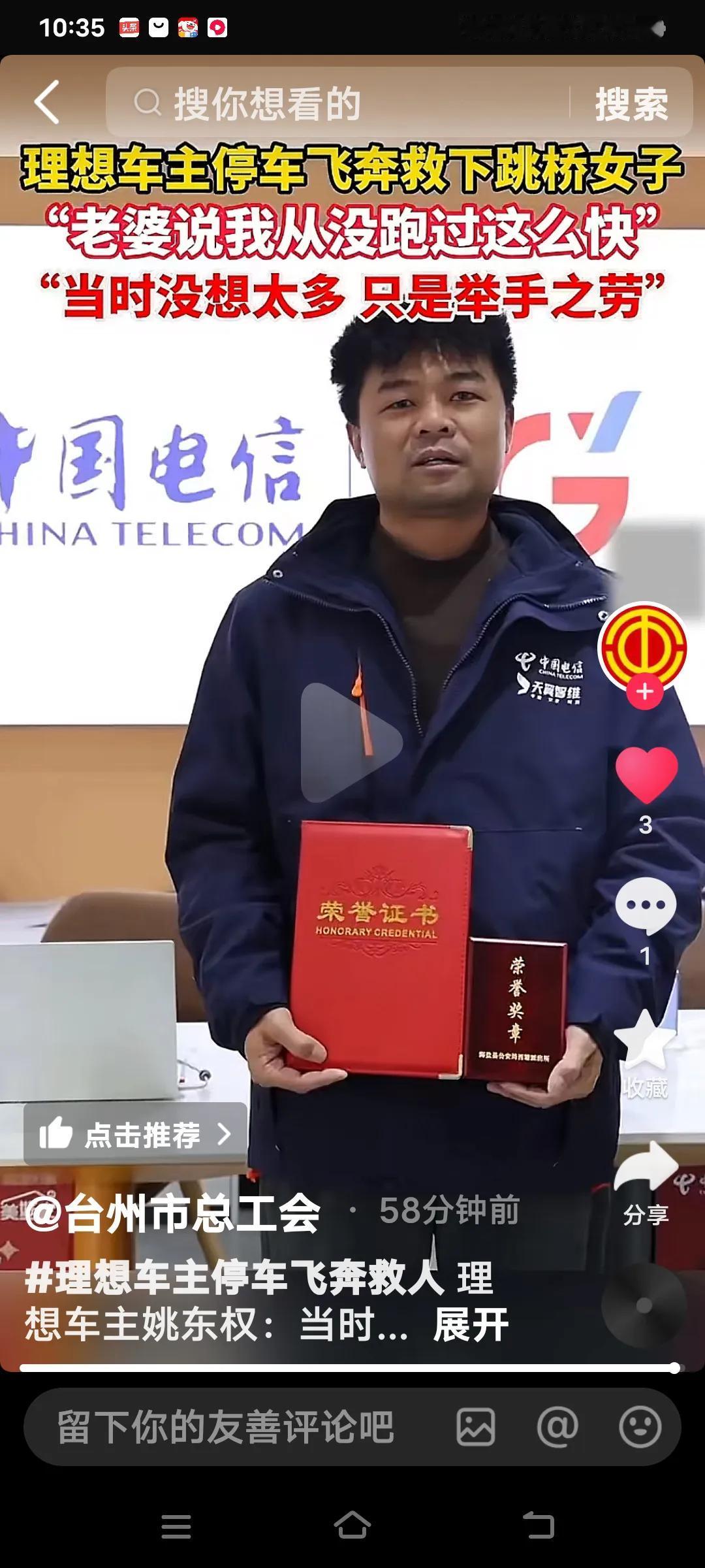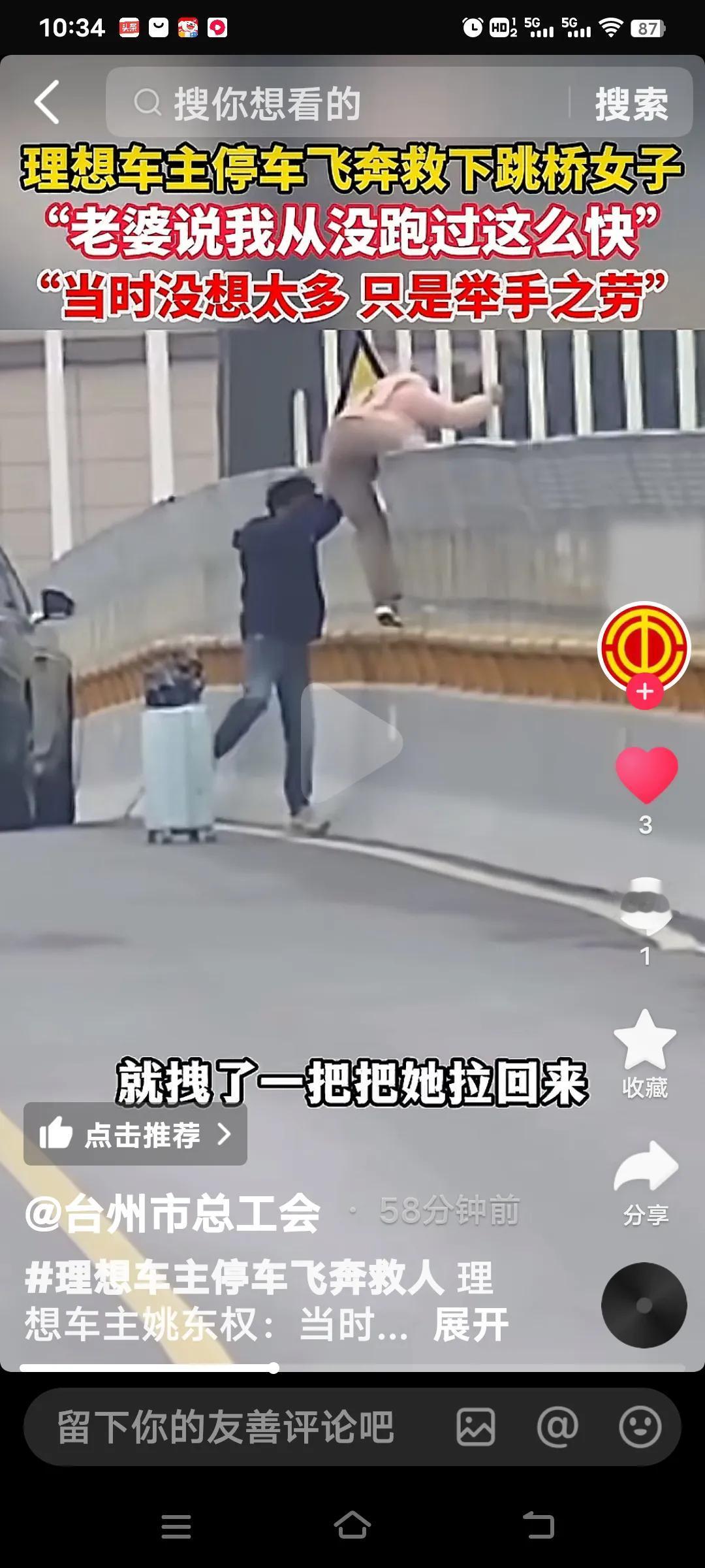 最近,浙江嘉兴发生了一件极为感人的事。1月27日中午,在海盐西塘大桥上,一名女子翻越护栏悬在桥外,意图轻生。 车牌号为浙FFJ3808的理想车主姚东权驾车路过此地,他立刻紧急刹车,飞奔过去,一把抓住女子的手臂和腿部,仅用20秒便将其拖回安全区域。 姚东权是中国电信海盐分公司的装维经理。救下女子后,他暖心安慰并托住她,生怕她再次产生轻生的念头。由于当时跑得匆忙没带手机,他便呼喊路人报警。 他的老婆表示,从未见他跑得那么快。他觉得一个人连死都不怕,还有什么可畏惧的,救人最为紧要。从视频看到女子往桥栏上爬,她身后还有个骑电动车的人经过,有些人可能就不愿多管闲事。所以,确实要为这位英雄点赞,他挽救了一个家庭啊!冬日生活打卡季 浙江嘉兴救人