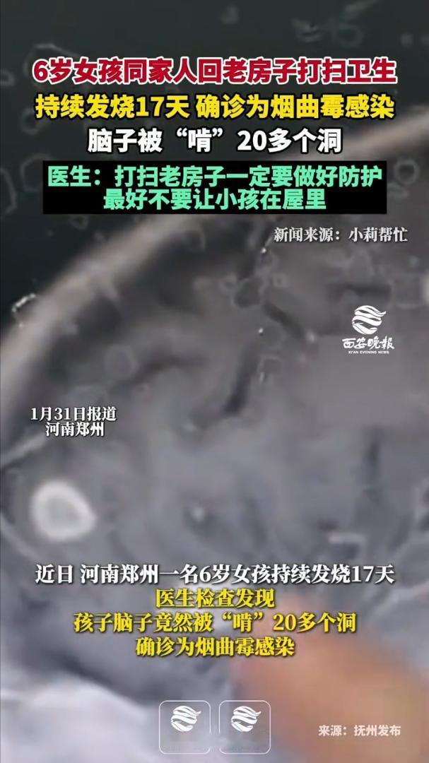 河南郑州,6岁女孩随老人回农村老家打扫房间,回家后持续发烧,家人以为是中邪了,想尽办法也没有退烧。最后在大医院查出脑子被啃了20多个洞。医生:打扫老房子一定要做好防护,最好不要让小孩在屋里。 临近年关,已经搬进城里多年的老人,想着春节要到了回农村老家把老屋收拾一下。 恰好6岁的孙女也放了寒假在家,老人便带着孙女一起回了老家。由于老家已经多年无人居住,房屋里积满了灰尘。小女孩很勤快一同帮着爷爷奶奶收拾了一天的屋子。 可是回到城里的第二天,小女孩便发起了高烧。老人以为孩子小回老家撞到了什么脏东西,便用了一些农村的土办法治疗,但是一直没有效果,孩子一直高烧不退。 家人又带着孩子到附近的诊所和医务室去看了看,也都是没有确诊,只是开了一些退烧的药物,孩子却还是一直高烧不退。 最后家人带着孩子到了省里的大医院进行诊治,最后确诊为烟曲霉感染,孩子的脑子已经被啃了20多个洞,好在救治及时,否则孩子最终会变为一个傻子。 原来,孩子在陪老人打扫老屋时吸入了大量的霉变粉尘,真菌随着血液进入了大脑,导致高烧不退。 医生也提醒大家,在打扫长期无人居住的房间时一定要做好科学防护,最好不要让儿童参与或接触这样的环境。 此事发生后,也引发了网友热议,有的网友说,小时候,去爷爷奶奶家,老屋子进去翻箱倒柜,出来眼通红,睁不开。。。然后奶奶让我朝天吐三口唾沫,然后就好了。 也有的说,这个霉菌我可领教过,我北方人住了南方潮湿的房子可能没抗体,居然鼻子里感染了霉菌,快吓死我了,鼻子里长霉菌,还长特别快,隔几小时长一坨……简直了 还有的说,我也是,有一回收拾了一个很久没打扫的仓库,然后就发烧了,肚子疼,全身没劲。 过年了大家在打扫卫生的时候一定要做好个人防护,尤其是老人和孩子一定要少接触这样的环境,以免对身体造成伤害。