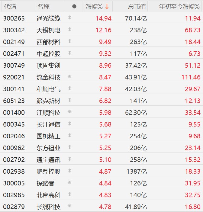 格隆汇2月2日|A股市场商业航天股逆势上涨,截至半日收盘,通光线缆涨超14%,天银机电涨超12%,西部材料、中超控股涨超9%,顶固集创、流金科技涨超8%,和顺电气涨超7%,派克新材涨超6%,江顺科技、长江通信、国机精工、东方钼业、通宇通讯涨超5%。