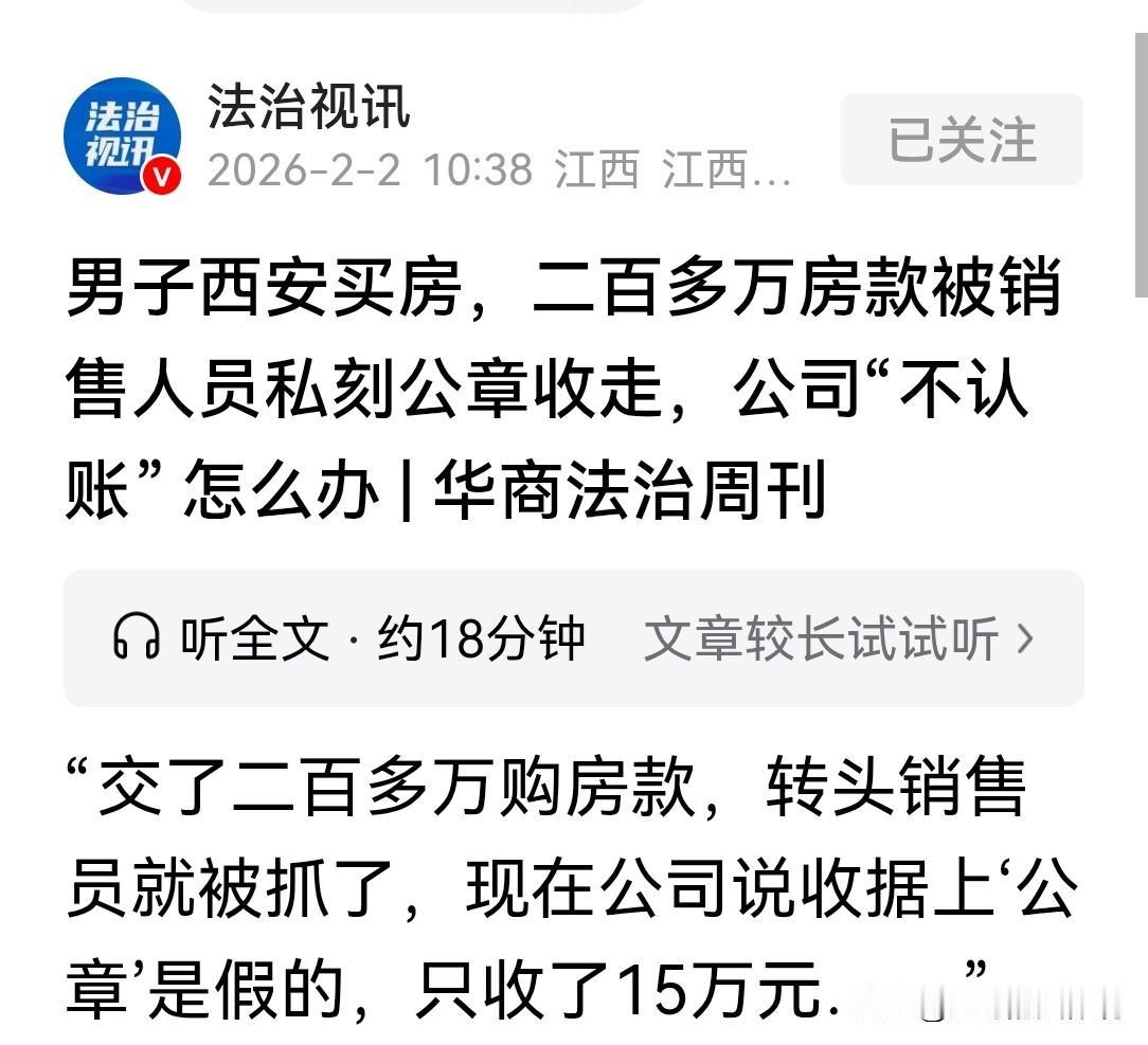 陕西西安,男子靠收废品,买下一套总价380多万,200多平米的商铺。在交了50%的房款后签下合同,销售称,为了避税要交12%的现金,男子照做。交房前,男子又东拼西凑付了288万多。可就在他准备接手商铺时,销售突然被抓,公司只收到十几万房款,其余被销售私吞,交不了房,钱也打了水漂,男子一下傻眼了!  置上一间商铺,等于给子孙后代置下了家产。 可马先生就做梦也没想到,他交了将近300万,却得到一个扎心的消息:负责和他对接的销售被抓了! 马先生在去年12月,看中一套临街商铺,面积200多平方,当时正出租。 之后,他和负责销售的贺某商谈,最终双方以总价383020元签订了购房合同。 合同约定,马先生需要在3到6个月内,付清总房款的50%,之后公司会将商铺现有的租赁合同转到他名下。 从2025年7月起,他就可以全权管理房产并收取租金。 到2026年底,付清剩余50%尾款后,公司将在收到全款后的10天内,无条件为他办理产权过户手续。 签完合同没几天,马先生就按照贺某的要求,在售楼部交了42万现金。 贺某称,公司为了避税,要求所有购房者,都要支付大约总房款12%的现金,并且这部分钱不会提供任何票据。 在接下来的半年里,马先生想尽办法,分几十次陆续向贺某支付了合同约定的50%房款。 之后他又多方筹措剩余款项,终于在2025年12月18日,完成了全部付款。 这些钱款通过微信、支付宝、银行卡转账以及现金等多种方式支付给了贺某。 就在他付清尾款,满心期待收房过户的时候。 不料,12月19日下午,他接到了房产公司一位负责人的电话。 销售员工贺某,因为财务问题,已经被公安机关控制。 他支付给贺某的购房款,没有被如实上交公司,要求他提供所有的转账记录,并配合调查。 马先生当即向公司提出要接收商铺,但公司方称,他们实际只收到了10多万元的房款。 马先生向公司提交了自己所有的付款证据,要求保障购房权益。 却再次被告知,案件仍在调查中,之前与他联系的那位公司负责人,也失联了。 从马先生手里的“收据”来看,他确实支付了所述的房款,所有经手人都是贺某。 “房产认购书”也明确写着,公司在收齐全部房款后,会在10个工作日内办理过户。 事发之后,马先生不敢再支付任何后续款项。 目前公司声称,合同和收据上的公章,是贺某私自刻制的,这让马先生陷入了不知所措的境地。 随后记者通过信息查询到,房产公司新变更的注册地址,未能找到该公司。 开发商提供了公司相关负责人的联系方式。 一位此前负责商铺销售的李先生表示,贺某已因涉嫌“职务侵占”和“合同造假”被警方控制。 经财务人员确认,马先生所交的款项中,只有15万元进入了公司账户。 现任销售负责人则表示,由于案件仍在调查,马先生的事情要等到案情清楚后才能处理。 马先生坚持要求公司履行合同。 他支付的房款中,有很多是向亲友借来的,还有一部分是从网上贷的款。 如今变故突生,偿还这些债务已经让他焦头烂额。 他不敢想象,如果最终商铺无法过户,或者钱款追不回来,该如何面对家人。 难道公司不知情,就无责任了吗? 有法律人士表示,刑事责任的承担,并不能免除民事赔偿责任。 依照法律,涉案职员需向所在公司退还侵占款项,若造成公司其他损失,还需依法赔偿,并对消费者直接承担清偿义务。 基于付款事实形成的债权债务关系,涉案职员需向消费者返还购房款、货款及利息损失。 那么,从法律的角度来分析,如何看待马先生的遭遇? 下一步,马先生又该如何讨回自己的房款,或者讨回自己的商铺呢? 依据《民法典》第172条:行为人没有代理权、超越代理权或者代理权终止后,仍然实施代理行为,相对人有理由相信行为人有代理权的,代理行为有效。 这条法律是关于“表见代理”的规定,简单说就是:如果一个人看起来有某个公司的代理权。 比如是公司员工、有公司手续,让普通人合理相信他能代表公司做事。 那么他的行为后果要由公司承担,哪怕公司说他没权限或“私刻公章。 贺某作为房产公司销售,与马先生签订购房合同、收取房款,这些行为符合销售的正常职责,马先生有理由相信贺某是代表公司行事。 即使贺某私刻公章、截留房款,只要马先生(不知道贺某造假),就构成表见代理,贺某的行为后果应由房产公司承担。 公司以只收到15万、贺某私刻公章为由拒绝交房,法律上不成立,公司仍需履行合同或退还马先生已付房款。 找公司办事时,只要对方是公司员工、按正常流程操作,普通人没必要怀疑其“权限”,法律会保护这种合理信任。 比如,马先生按销售要求付款,即使钱被员工私吞,公司也得先承担责任,再去追究员工的过错。 消费者要牢记,任何绕开公司正规财务渠道、要求支付巨额现金,又不开票的操作,要坚决说不! 对此,你怎么看?