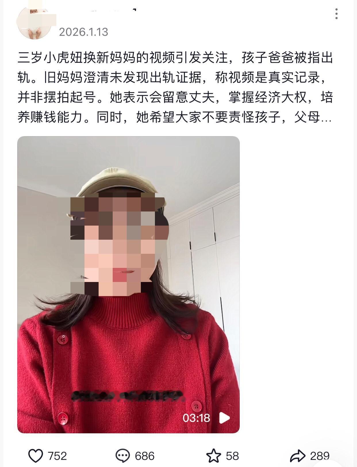 “新妈妈还给我看电视,陪我玩手机”,好可疑的一句话,起因是三岁女儿当着爸爸的面对妈妈说要让爸爸换新老婆。 起初爸爸还只是当作玩笑话,满脸笑嘻嘻的重复女儿的话。但女儿接下来的话却瞬间就让他笑不出来了。女儿说:“新妈妈还让我看电视,新妈妈还让我玩手机,我不要她(亲妈妈)了。”。 视频发到网上后很快就引起了网友热议,网友纷纷评论说这个爸爸有情况,并且细心的网友们总结了四个点: 1、女儿见过新妈妈了,不止一次。 2、新妈妈给看电视玩手机(两个人约会,让孩子老实一点转移注意力)。 3、爸爸大概试探过,妈妈总是打你,爸爸给你换个新妈妈好不好。 4、爸爸肉眼可见的慌张,脸色瞬间就变了。 很快这位妈妈发了一条视频,表示最初她看到网友的那些评论后跟老公吵了一架,老公怪她相信网友却不信他。他说网友不知道他们在什么样情况下拍的这条视频,不能因为一条视频就怎么样。妈妈觉得爸爸说的也对,而且该查的手机她也都查了,但是毫无发现,她后续自己也会更加留意的,所以拜托网友们能够嘴下留情。