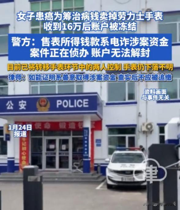 陕西西安。一女子患上重病想要卖掉自己的劳力士看病,事情也很着急,立刻找了买家。谁知道买家刚打款进来账户就被冻结,女子的手表钱完全就不能动了。后来了解到原来买家的账户是涉诈资金,女子提供了各项治疗证据,证明自己真的是为了治病,但是目前的答复是:没结案的话,钱不能动,法大于情。 据报道称,雷女士之前病症在脖子,这些年转移到了肺部,病情非常严重,所以等着治疗。但是,现在没钱看病了,身体情况也很不好。(本新闻来源:津云) 雷女士在10年前,就确诊了甲状腺方面的病症。当时也做了手术,并且得到了控制。 可是这些年,没想到疾病开始转移,病症已经转移到了肺部,情况不容乐观。 加上最近几年,雷女士跟丈夫一起经营的烧烤店,生意也不是很好,一直都入不敷出,还因欠下不少债务。加上患得了这个病,花费了不少钱在治疗方面,让家庭更加雪上加霜。 现在病情更加严重了,就需要继续治疗,然而治疗费用高昂,怎么才能凑够钱呢? 雷女士想到自己有一块珍藏多年的劳力士手表,为了凑足救命钱,她不得不忍痛割爱。 找到买家之后,雷女士就准备到店里验货,之后根据约定的时间,就见到了验表师,最后确定是正品。 当天就由个人买家给雷女士打了钱,一共是16.4万元。 当时雷女士确定了,救命钱已经到账,她准备第二天就去医院里缴纳费用。可是谁知道,第二天去医院缴费时,却被提示:银行账户被冻结了。 当时可把雷女士给急得,要知道,此刻的她就等着这笔钱做手术。没办法,她只能先联系银行,看看是怎么回事。 银行指出:是办案工作人员给的指令,因为这笔钱款涉嫌诈骗。 雷女士着急的很,因为她这一期的化疗费,就指着这笔钱了。当时就急得直跺脚,手表都卖了,正规的方式进行,怎么自己还要遭这个罪呢? 当时雷女士也跟办案人员取得了联系,回家就把所有的证据,包括跟平台的聊天记录、验表的视频、销售的合同等等,全都提交上去。 但是办案人员看到,雷女士是脱离平台交易的,也就是并没有在二手平台上操作,而是自己找了买家,自己去完成了交易。 所以,走线下的方式可能存在过错,也有嫌疑风险,银行卡暂时还不能解封。 根据工作人员这边的调查显示,这笔钱款,是嫌疑人骗取受害人的转款,回头再转到雷女士的卡上。 办案人员的意思是,如果想要快点拿到钱,只能跟受害人协商,两个人各自分摊损失。 雷女士表示无法接受,因为一方面自己的手表下落不明、一方面自己还等着钱急救命、如今还让自己跟受害人去分摊损失,这就让她实在无法接受。 对此,雷女士感到非常无助,更多的是委屈。办案人员也指出:“实在没办法,法大于情,没有结案,银行卡没法解冻,只能让这笔钱一直冻结着。” 目前,办案人员已经将转移手表环节中的两人控制,手表暂时还不知去向、钱款暂时也无法解冻。 本案释法:雷女士急用钱就出售自己的二手大劳,但是她脱离了平台进行交易。这样的行为存在怎样的风险? 根据《民典法》规定,作为正规平台,会确保消费者的合法权益,平台会采用“资金托管”的方式进行管理,确认收货之后才放款,确保客户的交易保障、维权也有法可依。 由此可知,正规的二手交易平台,通常可以提供支付担保、交易留痕、纠纷调解等机制,但是如果一旦脱离的平台进行私下转账,这些保障全都失效。 所以说一旦脱离的正规的平台,缺失了托举,证据链就会断裂,即便有微信聊天记录、口头约定等,也难以形成证据作证,发生争议举证也会非常困难。 面对雷女士的遭遇,可以说非常心痛。不是为了治病,也不会将自己的珍藏之物销售掉,而且如今还在等着救命钱。 正如雷女士的婆婆所说:现在急死都没用了,手表没了、钱没了、可能还要背上犯罪之名,连病都没法治了。不知道什么时候能解冻,要知道,疾病是等不起的! 对于现在这个情况,大家说说看,可该怎么办?