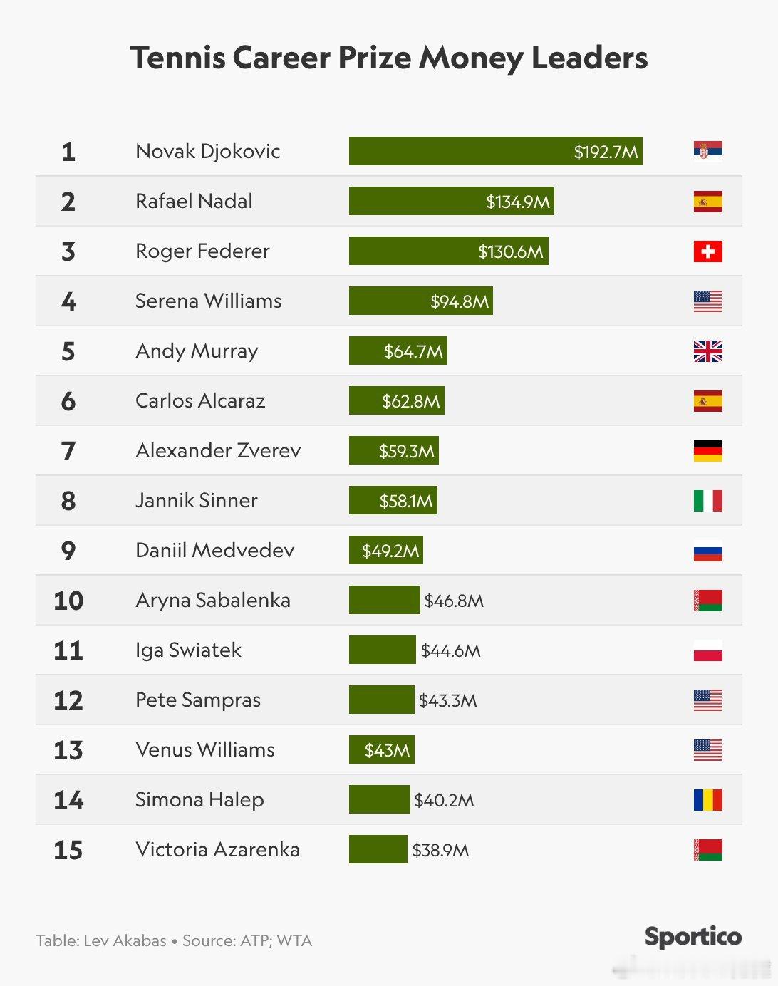 阿卡澳网夺冠拿到280万美元奖金,成为ATP历史上第五高收入者(6280万美元) 1、192,742,584: 德约科维奇2、134,946,100: 纳达尔3、130,594,339: 费德勒4、94,816,730: 小威5、64,687,542: 穆雷6、62,908,473:阿尔卡拉斯7、59,310,086: 兹维列夫8、57,498,420: 辛纳9、49,267,323: 梅德韦杰夫10、46,789,918: 萨巴伦卡11、44,612,955:斯瓦泰克阿尔卡拉斯首夺澳网冠军阿尔卡拉斯实现全满贯