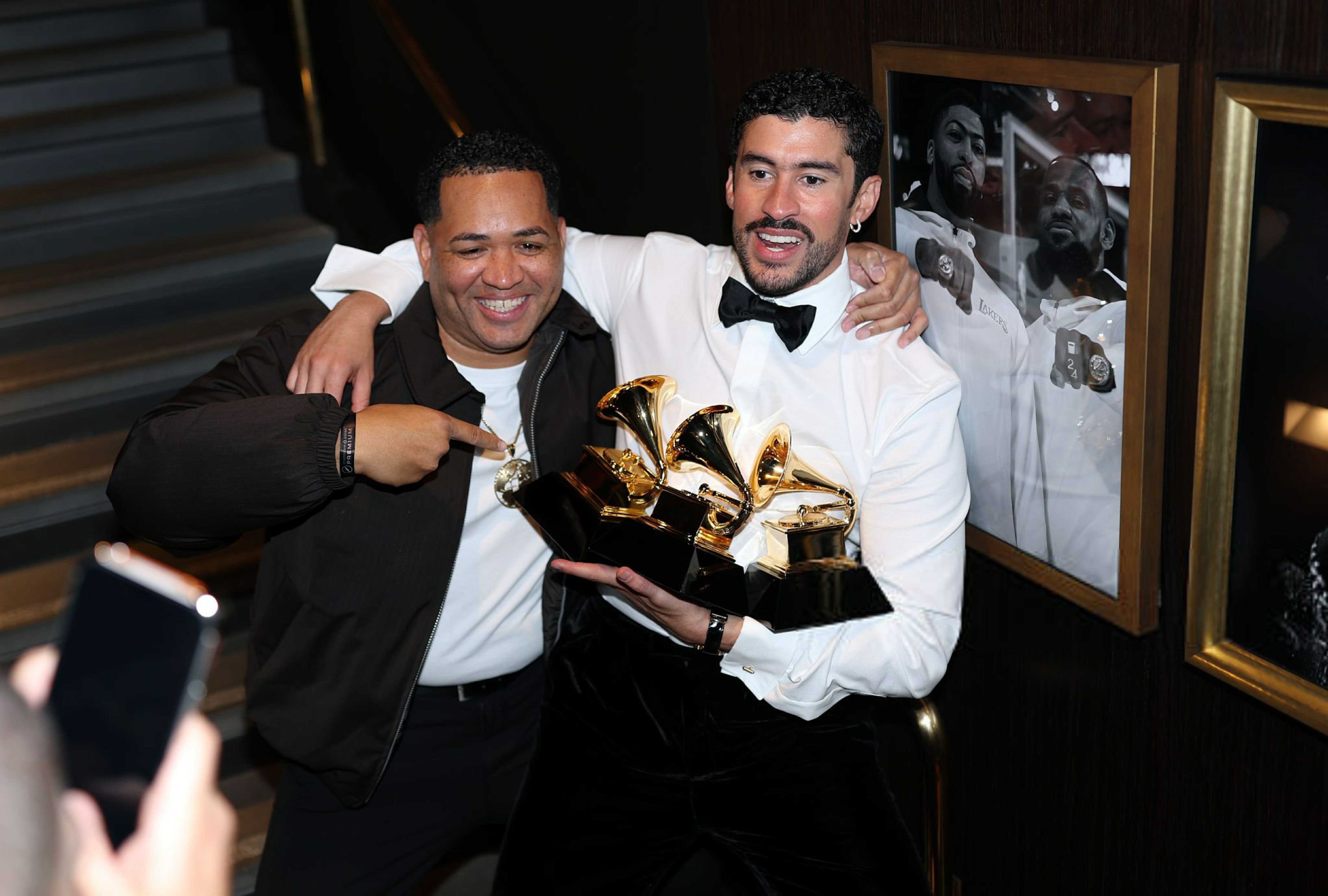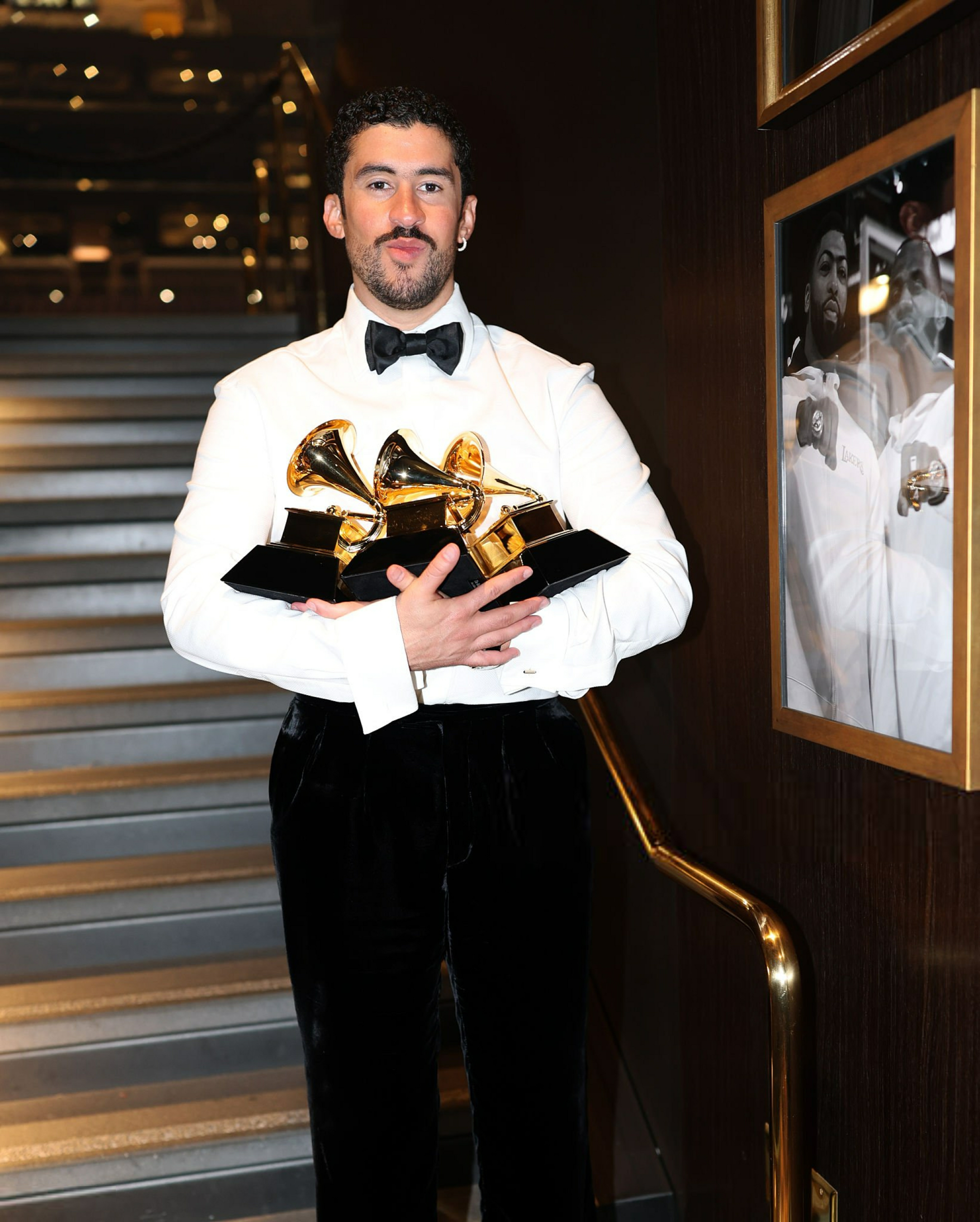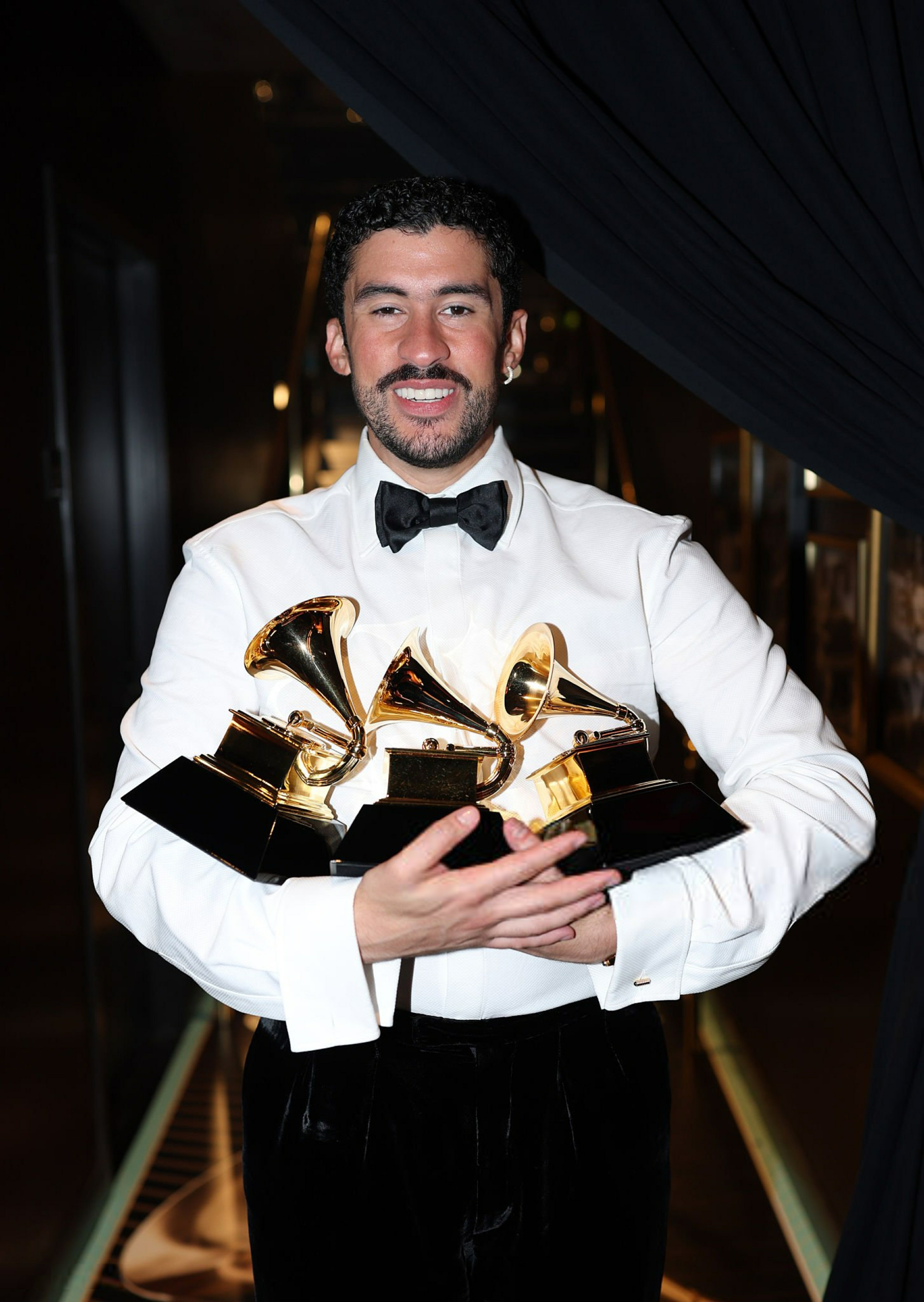 坏兔兔Bad Bunny开心展示自己的三座格莱美留声机!他拿下年度最佳专辑、最佳