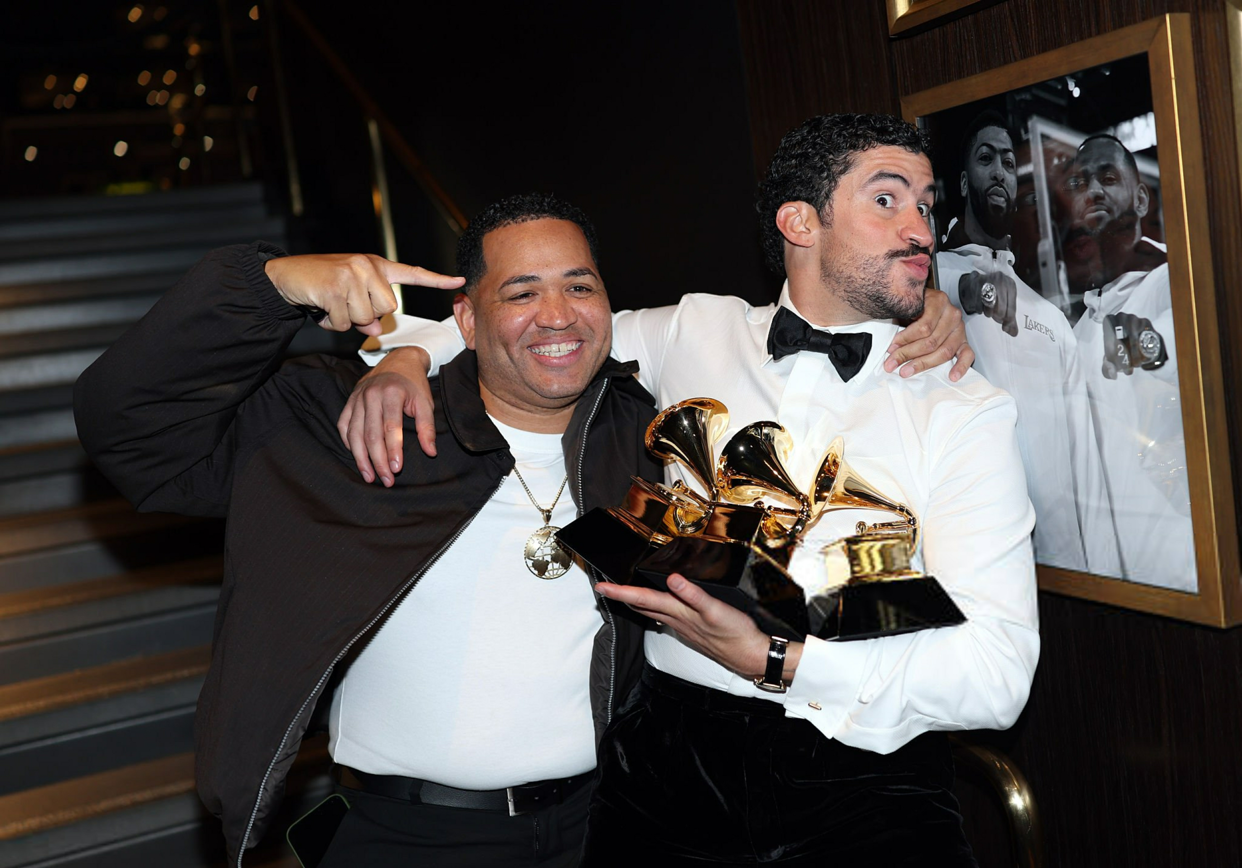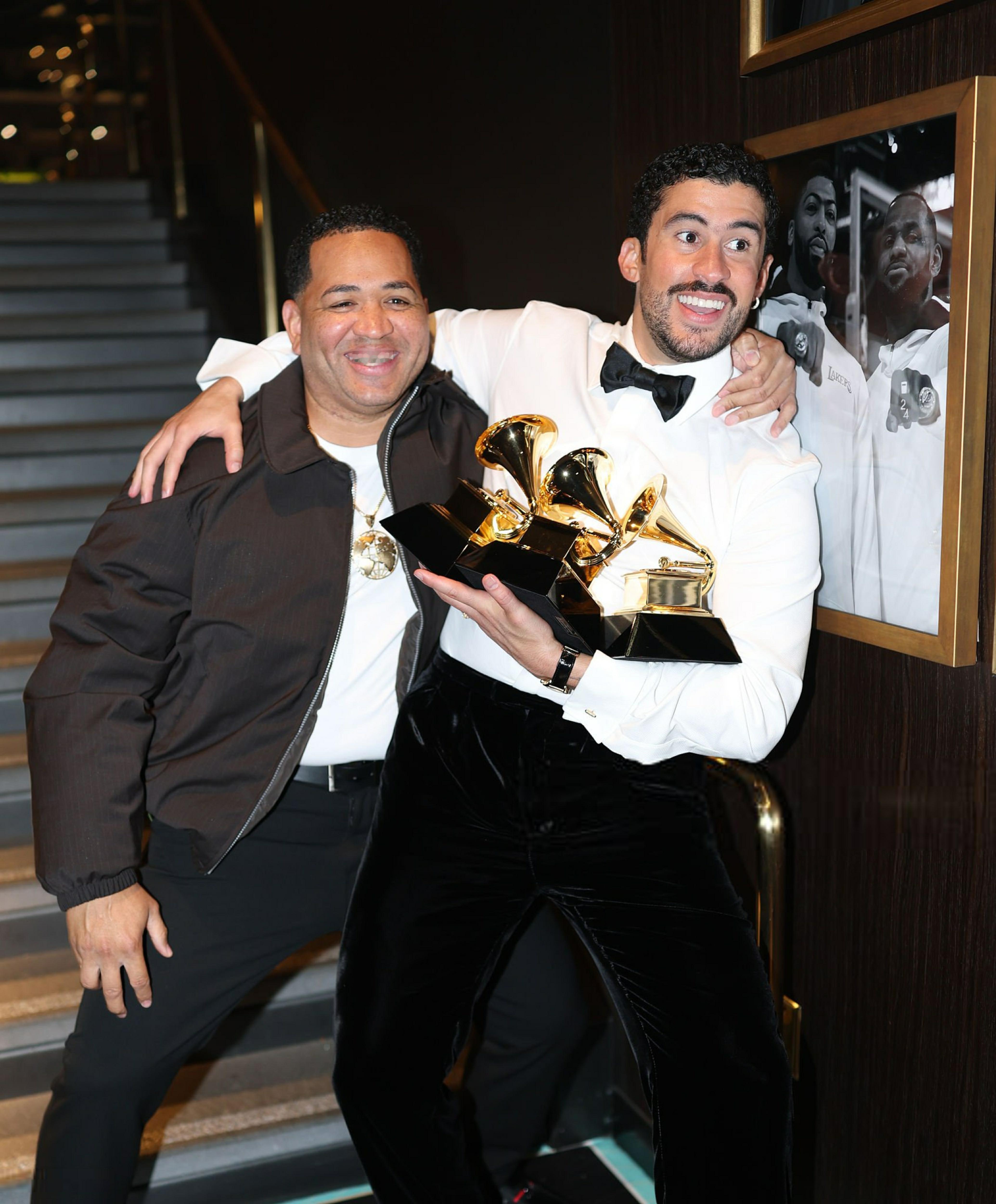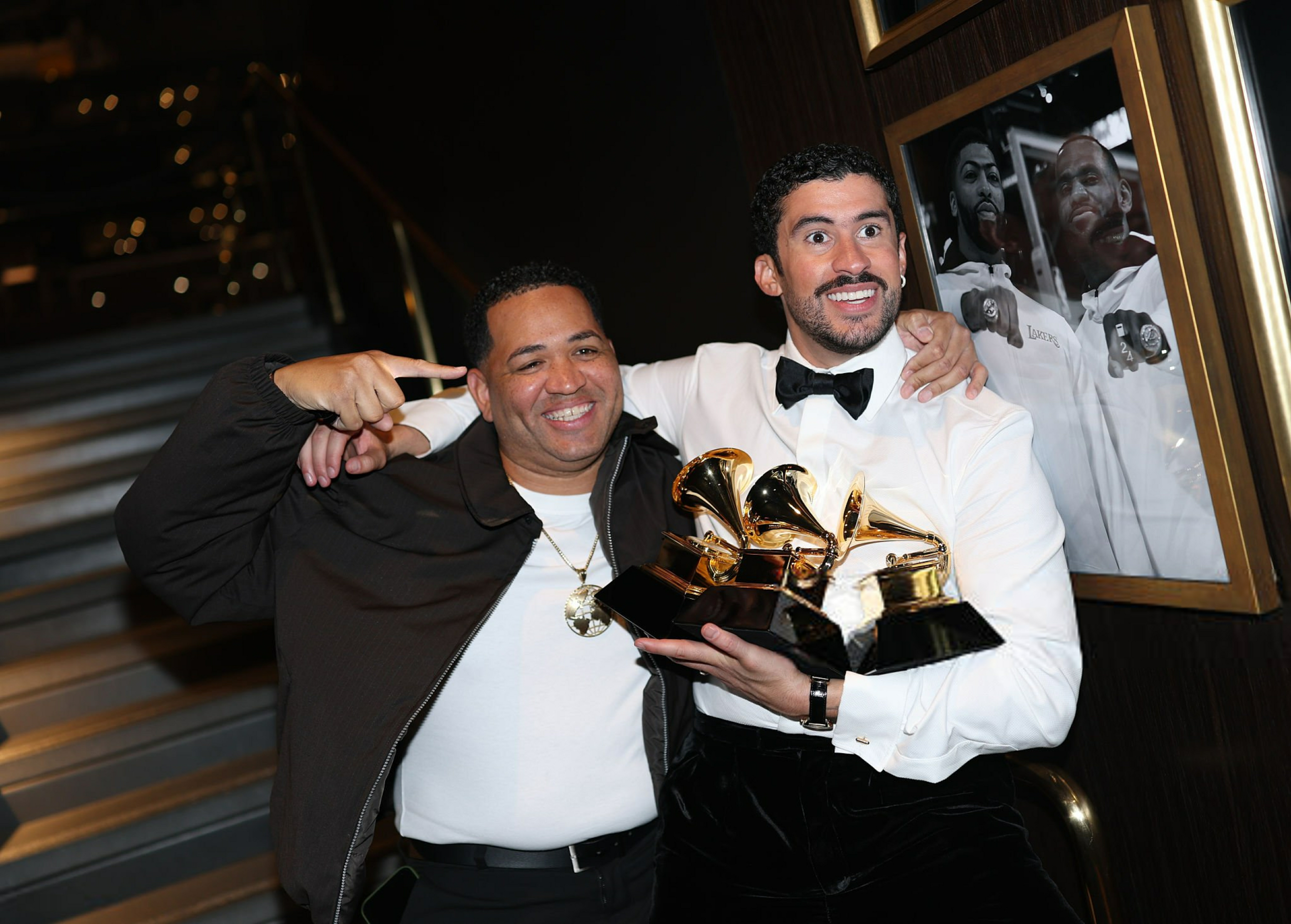坏兔兔Bad Bunny开心展示自己的三座格莱美留声机!他拿下年度最佳专辑、最佳