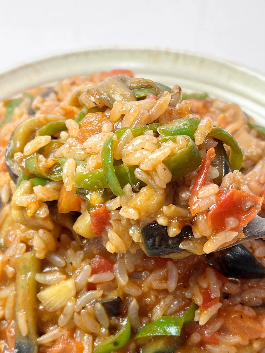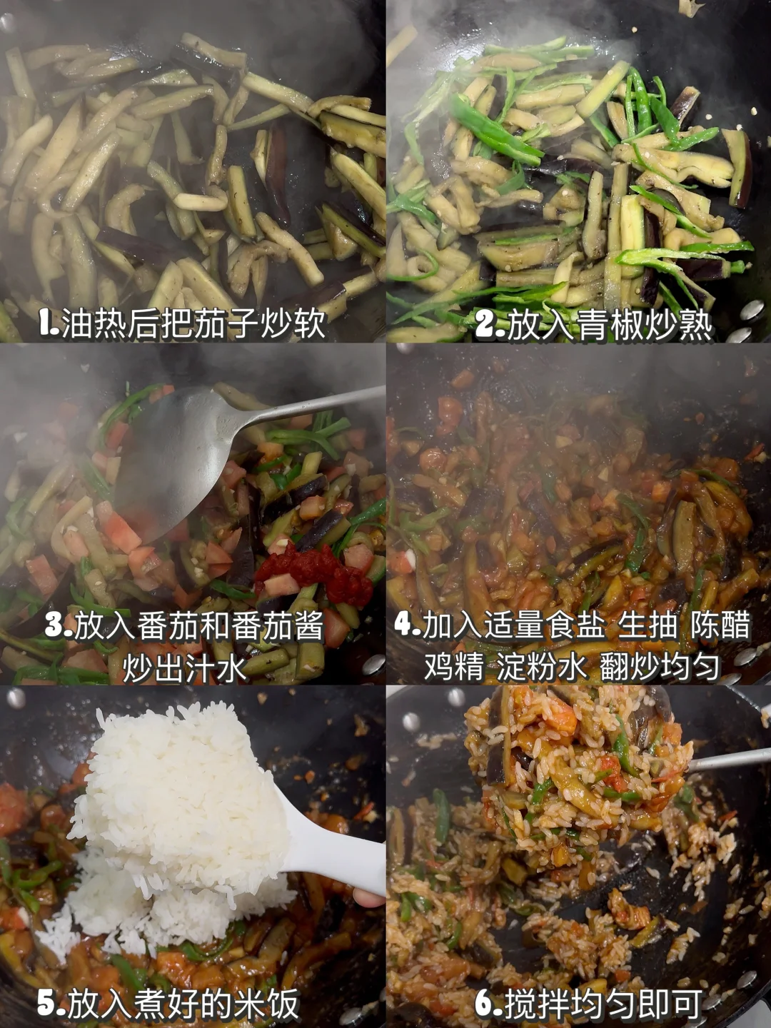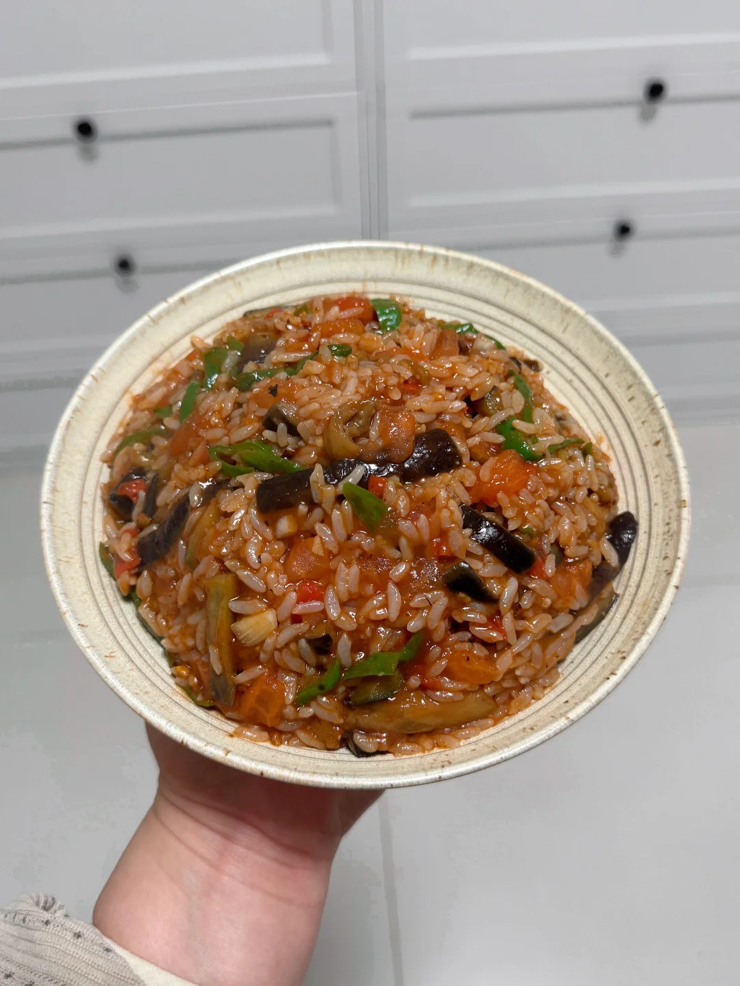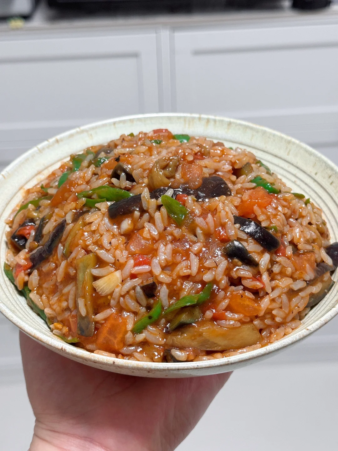 饭还没煮好,厨房已经飘满米香。炒好的茄子辣椒西红柿往热饭上一盖,滋滋作响,拌匀之后每粒米都裹满汁,吃起来弹弹的,又香又润。这一口,真的绝了!