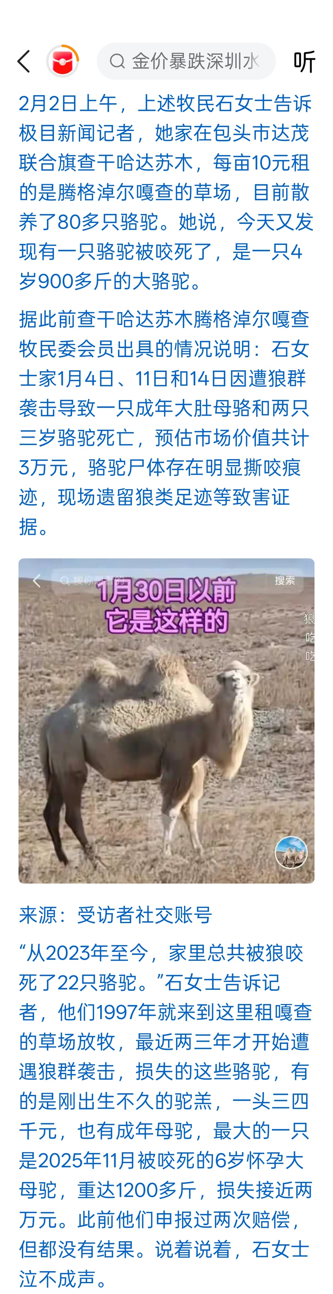 包头牧民称22头骆驼被狼咬死,最大的有1200多斤损失惨重,当地:正调查处理。现