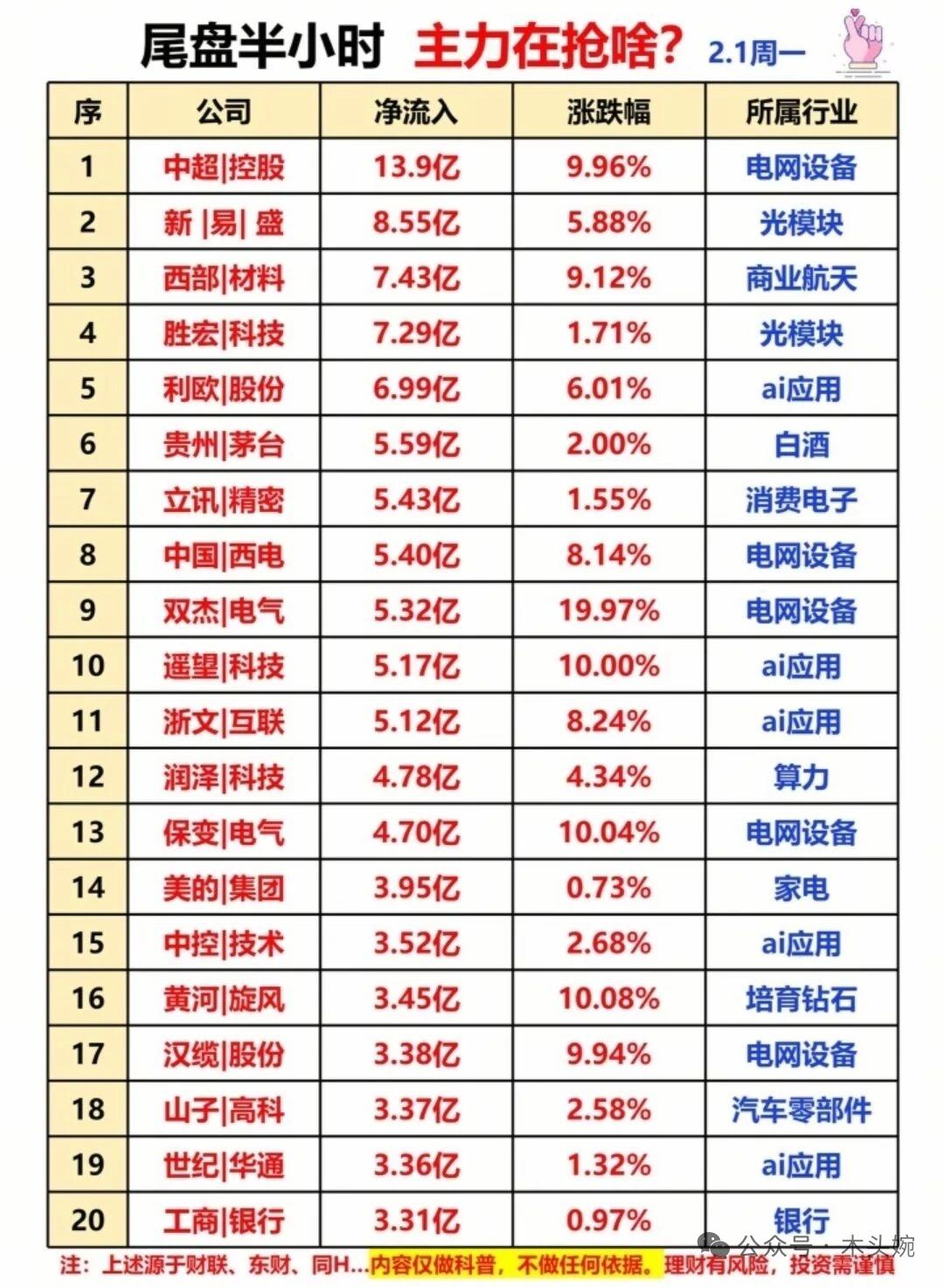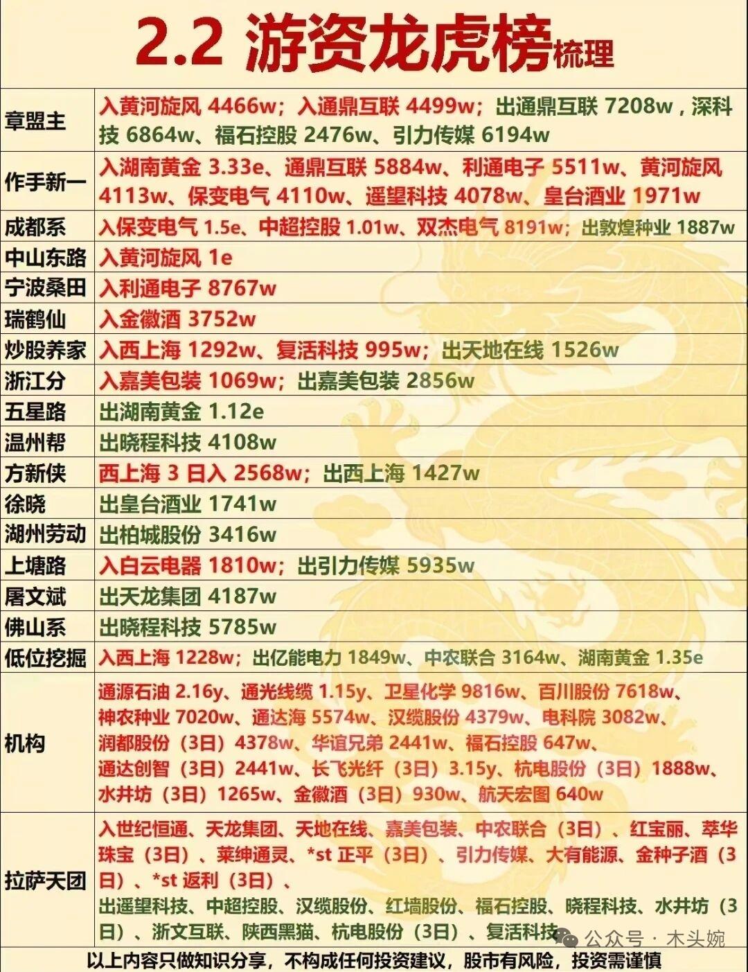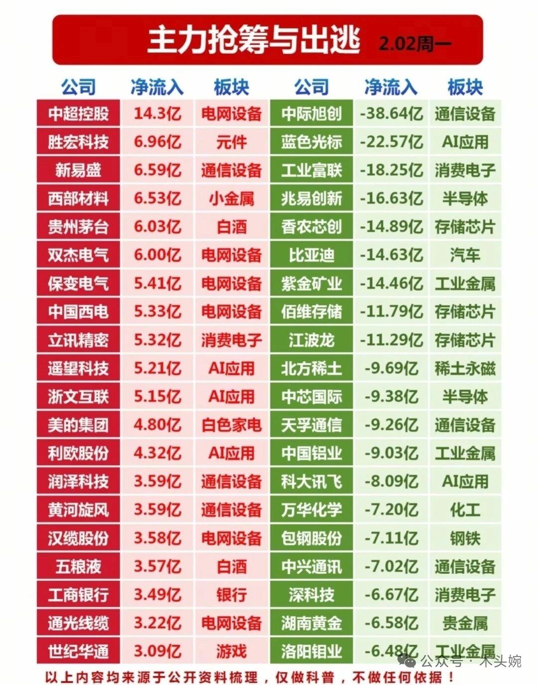 2月2日A股大跌的原因找到了,主力资金流入流出哪些板块?游资大佬买入卖出哪些个股? A股今天这波大跌,是全球资本“降风险”动作的连锁反应!贵金属史诗级跳水触发去杠杆,高波动资产集体承压,资金慌忙扑向白酒、电网等防御板块避险。 2月2日主力与游资资金动向出炉,主力在电网设备、白酒等板块抢筹,中超控股、贵州茅台获大额净流入,同时在通信设备、AI应用等板块出逃,中际旭创、蓝色光标资金流出居前。游资龙虎榜中,章盟主、作手新一、成都系等活跃资金在黄河旋风、通鼎互联、保变电气等标的上激烈博弈,机构与拉萨天团也在各自布局。资金的攻守之间,藏着市场当下的温度与情绪。 理财有风险投资需谨慎,资料取材网络仅供参考不能作为投资依据。