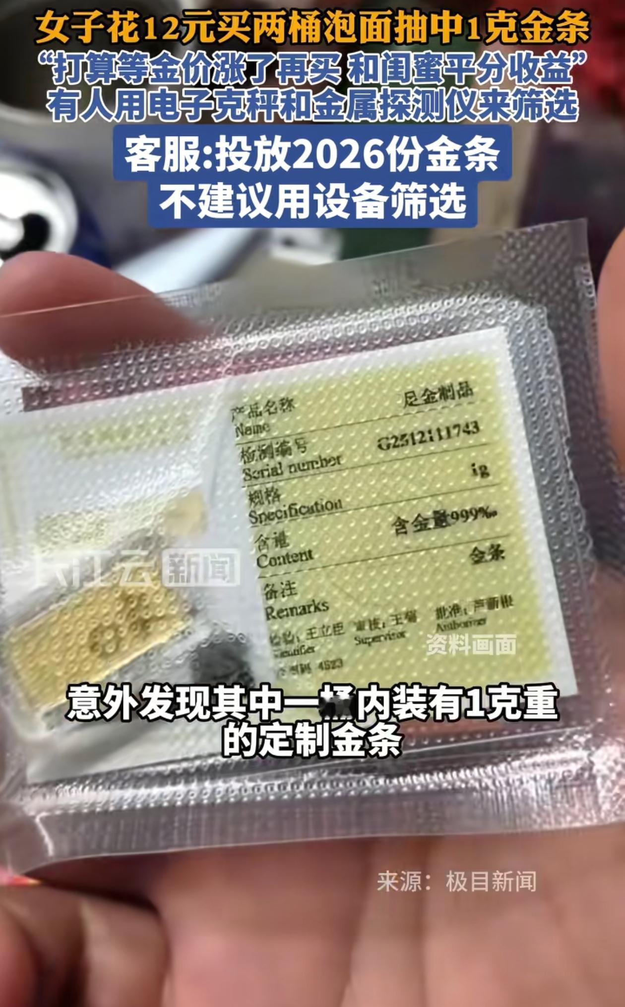 又想骗我买方便面!河南洛阳一女子花12买了两桶泡面,刚拆开就发现里面有个之前没见过的包装,她翻过来一看,竟然是根1克重的金条! 这样的好事什么时候能发生在我身上? 据这位女子所说,她和闺蜜两个人从洛阳出发,打算去开封旅游。中途可能是到高速服务区了,肚子有点饿,所以就买了泡面吃。 没想到她刚拆完其中一个,就发现了这个意外之喜。当时她还有点纳闷,把东西翻过来才明白里面装的是“金条”。 原来这是白象今年新推出的活动,他们在泡面里藏了2026根金条,每条都有差不多1克重,上面还印着“白象”两个字的标识,就看谁运气好。 女子也没想到自己恰好就是那个辛运儿,不过她倒是很大度,虽然两桶泡面只中了一个,她还是表示会和闺蜜均分,等金价一涨就立马卖出去。 这个活动吸引了不少网友,引起了热议。有网友说前两天看见一个人,拿个电子秤在那里筛选最重的,结果打开发现里面放了三根叉子!还有网友觉得拿个黄金探测仪去,是不是一探一个准? 其实白象这么做是为了给日常生活增添一些不经意的小惊喜,如果特意拿着专业仪器去测,反倒失去了那种意料之外的快乐。 如果想试一试自己的手气,可以明天就去买一桶,没有必要特意去试,就算没有中,至少泡面还能下肚是不是?