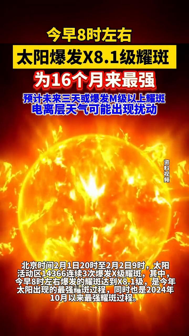 今早8时左右太阳爆发X8.1级耀斑,为16个月来最强。 北京时间2月1日20时至2月2日9时,太阳活动区14366连续3次爆发X级耀斑,其中今早8时左右爆发的耀斑达到X8.1级,是今年太阳出现的最强耀斑过程,同时也是2024年10月以来最强耀斑过程。 预计未来三天,太阳活动水平中等至高,有可能爆发M级以上耀斑;地磁活动以平静到微扰为主;电离层天气可能出现扰动。 国家空间天气监测预警中心会密切关注太阳的最新动态,及时为公众做好相关服务。