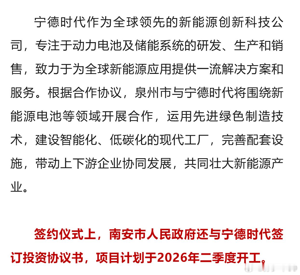 泉州市人民政府与宁德时代签署新能源电池生产基地项目合作协议。泉州市委书记张毅恭、