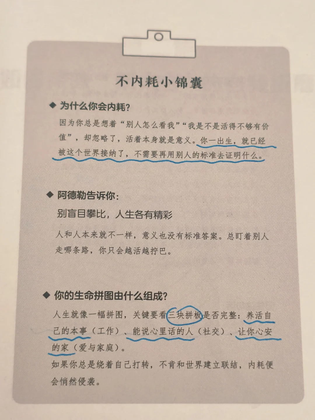 那些来自亲友的“期待”,像细密的网把我裹住。我盯着天花板哭,觉得自己既对不起学历,也对不起别人的眼光,连呼吸都在自我批判。直到翻到这本《不内耗》,阿德勒的书写让我明白:其实所有内耗,都是对他人期待的过度承担。