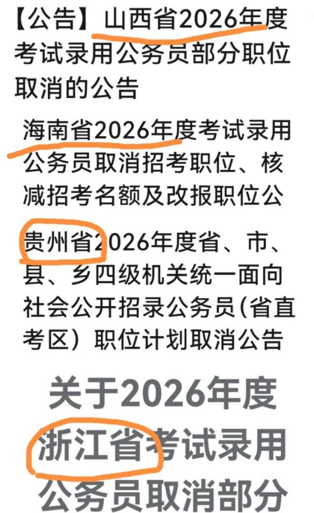 减少、取消公务员职位!考公的小伙伴们注意啦!最近各地公务员招考公告“扎堆”出炉,减少或取消一些岗位。 比如福建,一挥手就取消了10个职位的招录计划;南京、贵州、湖北等地,也有岗位因为没凑够“人气”等原因被撤下(详见附图)。 这可不是系统闹脾气,背后的原因还挺有戏—— 报考遇冷,岗位成了“单身派对” 有些职位由于要求太高(比如特定专业、证书)、地点有点“隐居”、或者工作强度堪比“升级打怪”,导致报名人数寥寥无几,甚至挂零。像福建就有两个职位审核通过人数完美保持“0纪录”,直接取消。招录机关为了保持竞争感和选拔质量,按规定:达不到开考比例(常见3:1)的岗位,就只能“黯然离场”。 除了这些,你还听说过哪些职位消失的奇葩原因? 评论区等你来“八卦”! 新锐领航权益升级 公务员岗位 公务员招录 考公政策变化
