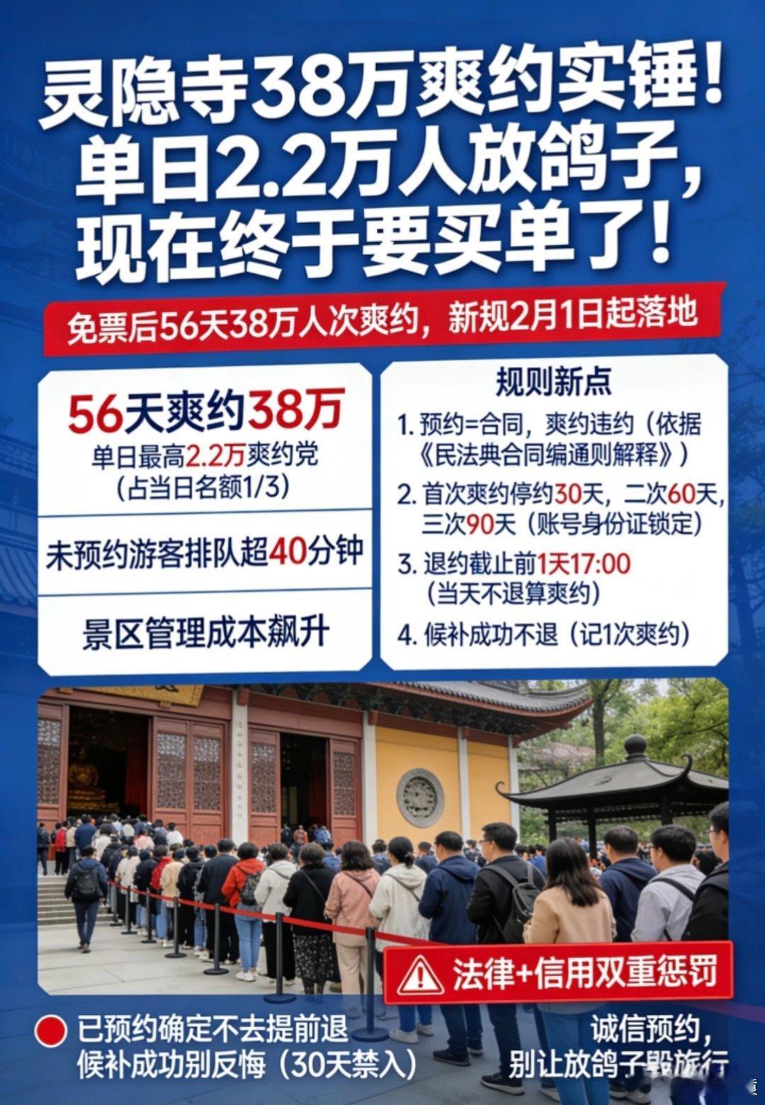 灵隐寺被38万鸽王上了一课意思是大家都预约了,但是很多人不来。好在出了新规则:爽