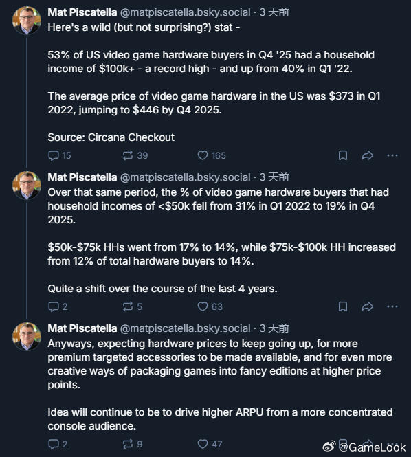【调查称:超50%购买主机玩家是高收入人群,穷玩家只配玩手游了?网页链接】最近,Circana的最新报告砸穿了玩家的心理底线。该公司执行董事 Matt Piscatella 在其社交媒体公布了一项关于游戏购买者收入的调查结果:截至2025年第四季度,美国买游戏机的家庭中,过半都是年入10万美元以上的“高收入军团”,较三年前暴涨13%。反观年收入低于5万美元的家庭,主机购买份额从31%惨跌至19%。