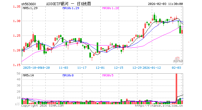 2月3日,截止午间收盘,A500ETF银河(563660)涨0.88%,报1.268元,成交额681.19万元。A500ETF银河(563660)重仓股方面,宁德时代截止午盘跌1.04%,贵州茅台涨2.10%,中国平安涨0.42%,中际旭创跌1.06%,紫金矿业涨2.76%,招商银行跌0.36%,新易盛跌4.13%,美的集团涨0.09%,兴业银行跌0.11%,长江电力跌0.61%。