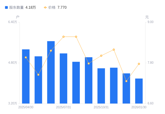 日期A股户数(户)流通A股户均持股数(股)户均持股市值(万元)2026-01-304183618987.6114.752025-12-314386018111.3913.152025-11-284608517236.9614.122025-10-314586217320.7813.872025-09-305021415819.6012.312025-08-294841916465.4914.112025-07-315169615421.7413.222025-06-305653714101.2511.512025-05-305056015768.2511.752025-04-305329414959.3311.91