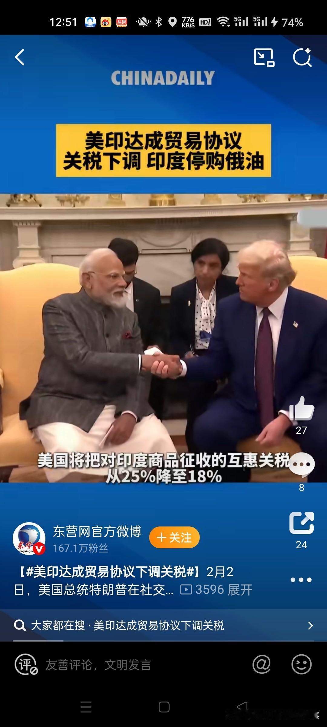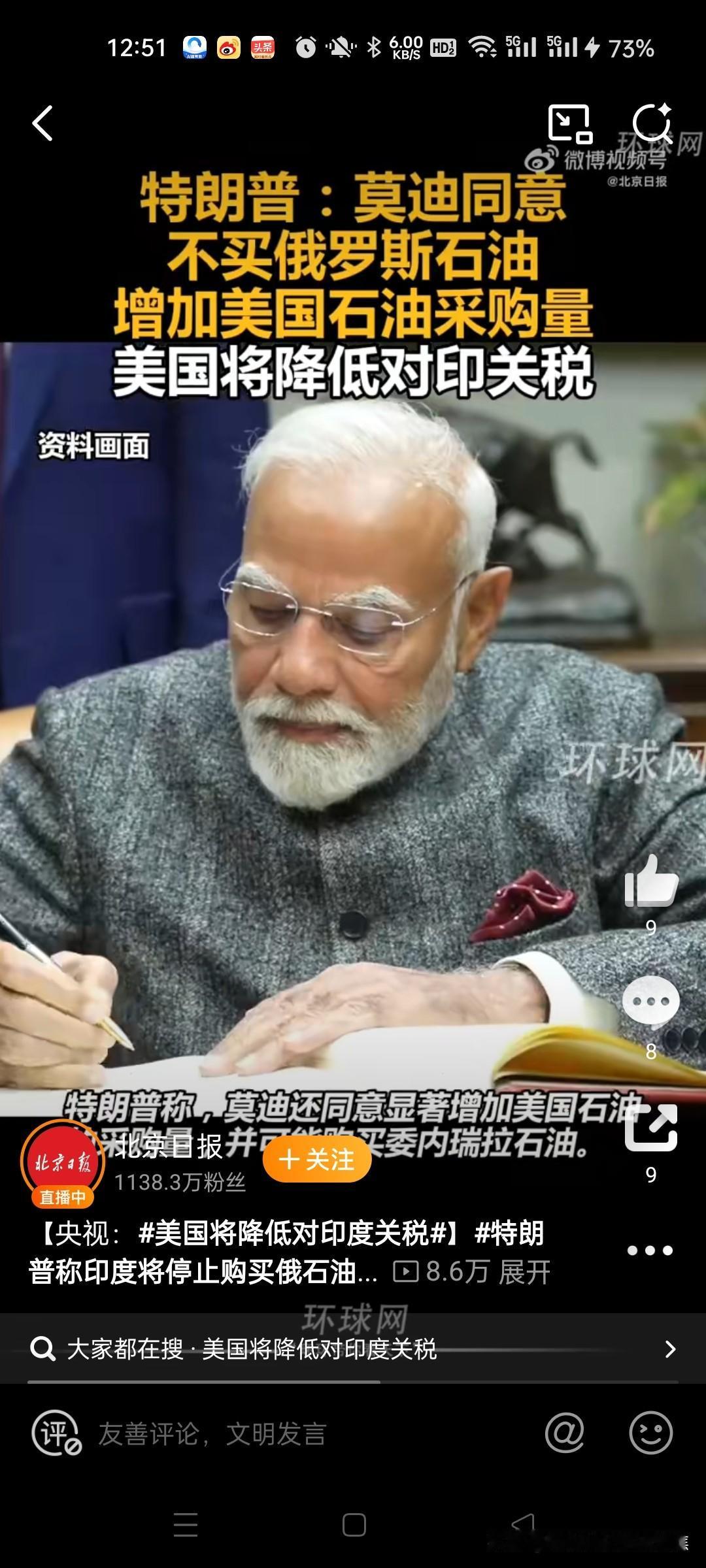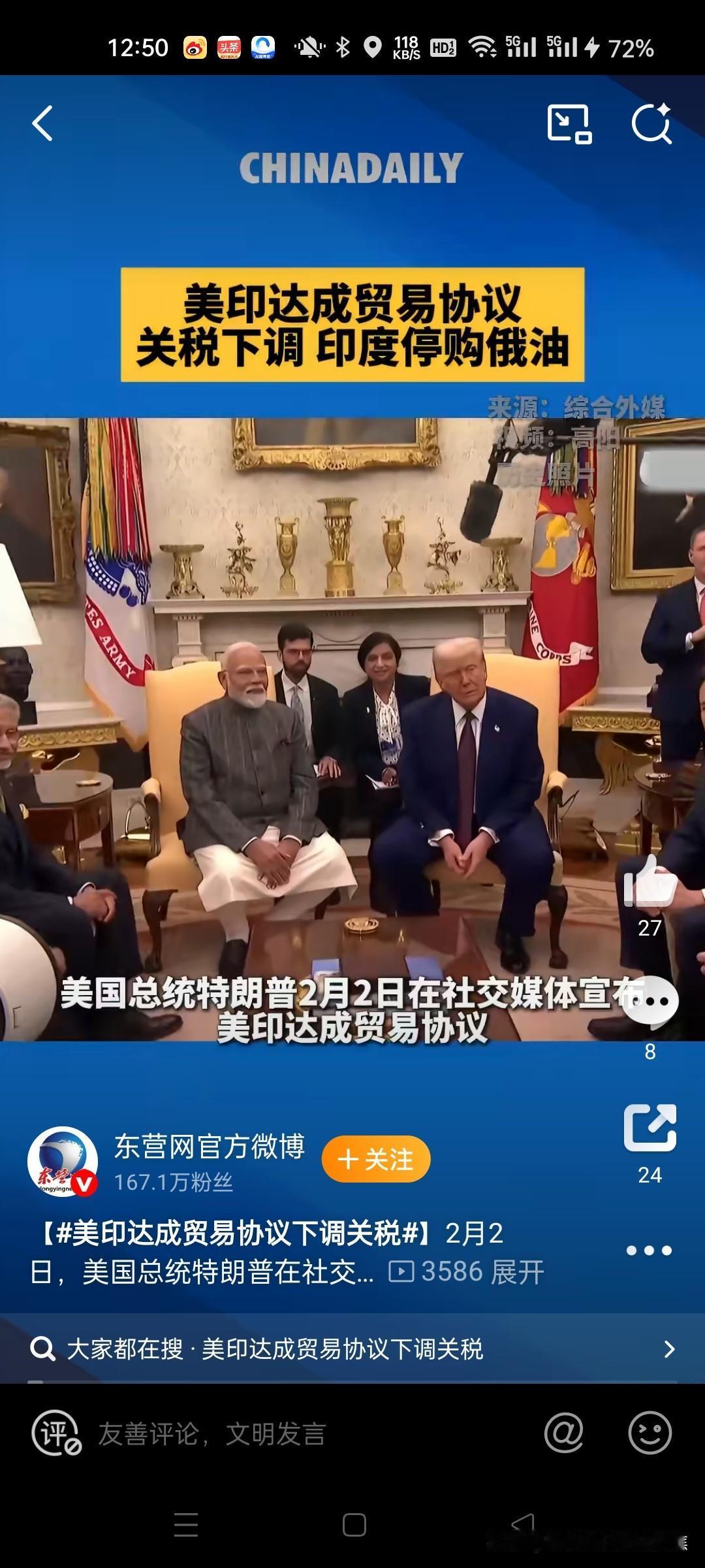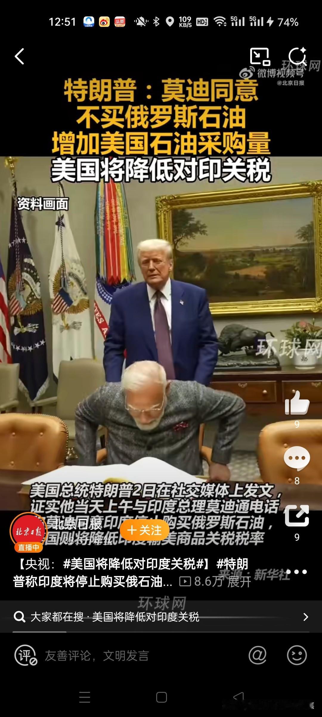 特朗普搞定了莫迪,印度承诺停止购买俄罗斯石油并转向采购美国能源产品。美国总统特朗普在2月2日宣布与印度达成重大贸易协议,将印度输美商品综合关税从约50%大幅降至18%,条件是印度承诺停止购买俄罗斯石油并转向采购美国能源产品。 一、协议核心条款 关税调整 美国将针对印度商品的“对等关税”从25%下调至18%,并立即生效。 同时取消2025年8月因印度进口俄罗斯石油而加征的25%惩罚性关税,使印度商品综合关税从约50%降至18%。@环球时报29 印度承诺逐步降低对美国商品的关税及非关税壁垒,最终降至零。@北京日报10 印度采购承诺 印度同意采购价值超过5000亿美元的美国产品,涵盖能源、技术、农产品、煤炭等领域。@环球网18 特朗普声称,印度将停止购买俄罗斯石油,转向进口美国石油及委内瑞拉石油。17央视财经东营网官方微博北京日报直新闻 二、双方表态与争议点 特朗普:高调宣布协议达成,强调印度停购俄油有助于“美国参与结束俄乌冲突”。@财联社APP1 莫迪:仅确认美国同意降低关税至18%,未提及停购俄油、采购承诺或关税降至零等细节,仅表示“欣喜得知结果”。@参考消息15 矛盾焦点: 特朗普称双方达成“双边贸易协议”,莫迪未明确承认协议存在。15 印度外交部此前多次否认特朗普关于“停购俄油”的声明(如2025年10月),此次协议真实性存疑。56 三、背景与市场影响 贸易摩擦历程 2025年8月,美国以印度进口俄石油为由,对印商品累计征收50%关税(25%基础税+25%惩罚税),导致印度对美出口连续下滑。@第一财经日报14 印度曾通过削减国内消费税、号召民众购买本土货应对关税冲击。@央视财经 原油市场反应 协议引发对印度这一“俄油最大买家”退出市场的担忧,人为移除稳定需求源导致油价短期承压。 2月3日亚市时段,美原油价格延续跌势至61.70美元/桶,日内跌幅0.7%。@财消息 四、潜在风险与争议 执行不确定性:印度是否真实放弃俄油尚待观察。2025年8月特朗普声称印度停购俄油后,印媒曝光炼油企业仍在采购。6 经济代价:印度承诺的5000亿美元采购额远超其2025年对美出口总额(865亿美元),可行性存疑。@新华日报 地缘政治压力:美方将贸易协议与俄乌冲突绑定,被批以关税施压印度选边站。14 五、未来展望 协议短期内缓解印度出口压力,刺激印度股指期货上涨及卢比走强,但长期取决于印度能否平衡对美承诺与能源需求。若印度停购俄油,可能重塑全球原油贸易格局,加剧市场波动。11