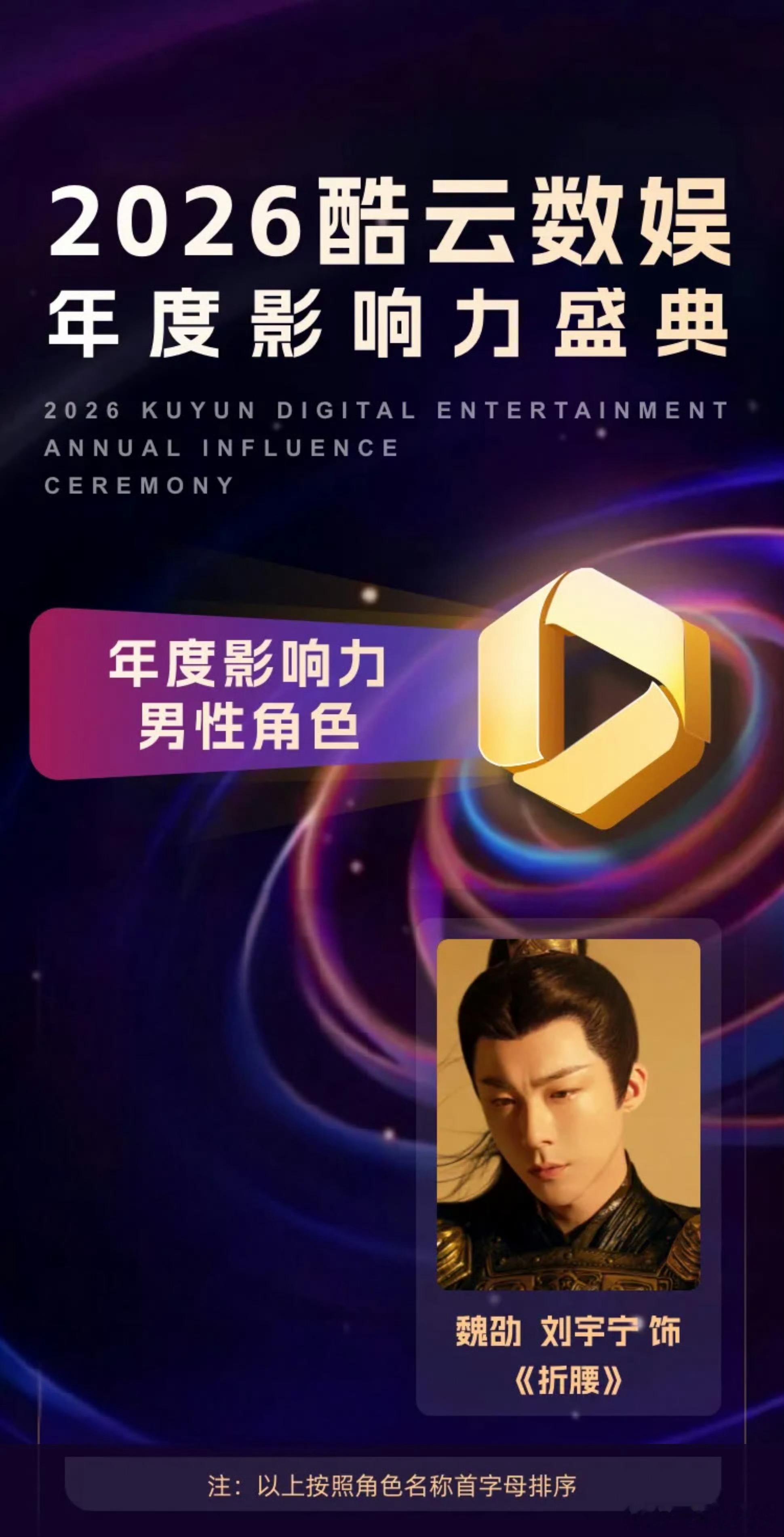 恭喜刘宇宁拿下酷云数娱年度影响力盛典5项荣誉。年度影响力男性角色-魏劭《折腰》年度人气男性角色-南珩/离十六《书卷一梦》年度人气男性角色-魏劭《折腰》年度影响力剧集-《折腰》2026年度期待剧集-《玫瑰丛生》不愧是拿下三平台聚集破万男主,又是收获的一年