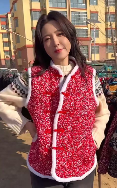 49岁曾黎穿毛衣+牛仔裤赶大集!街边试棉马甲好接地气,穿啥都美