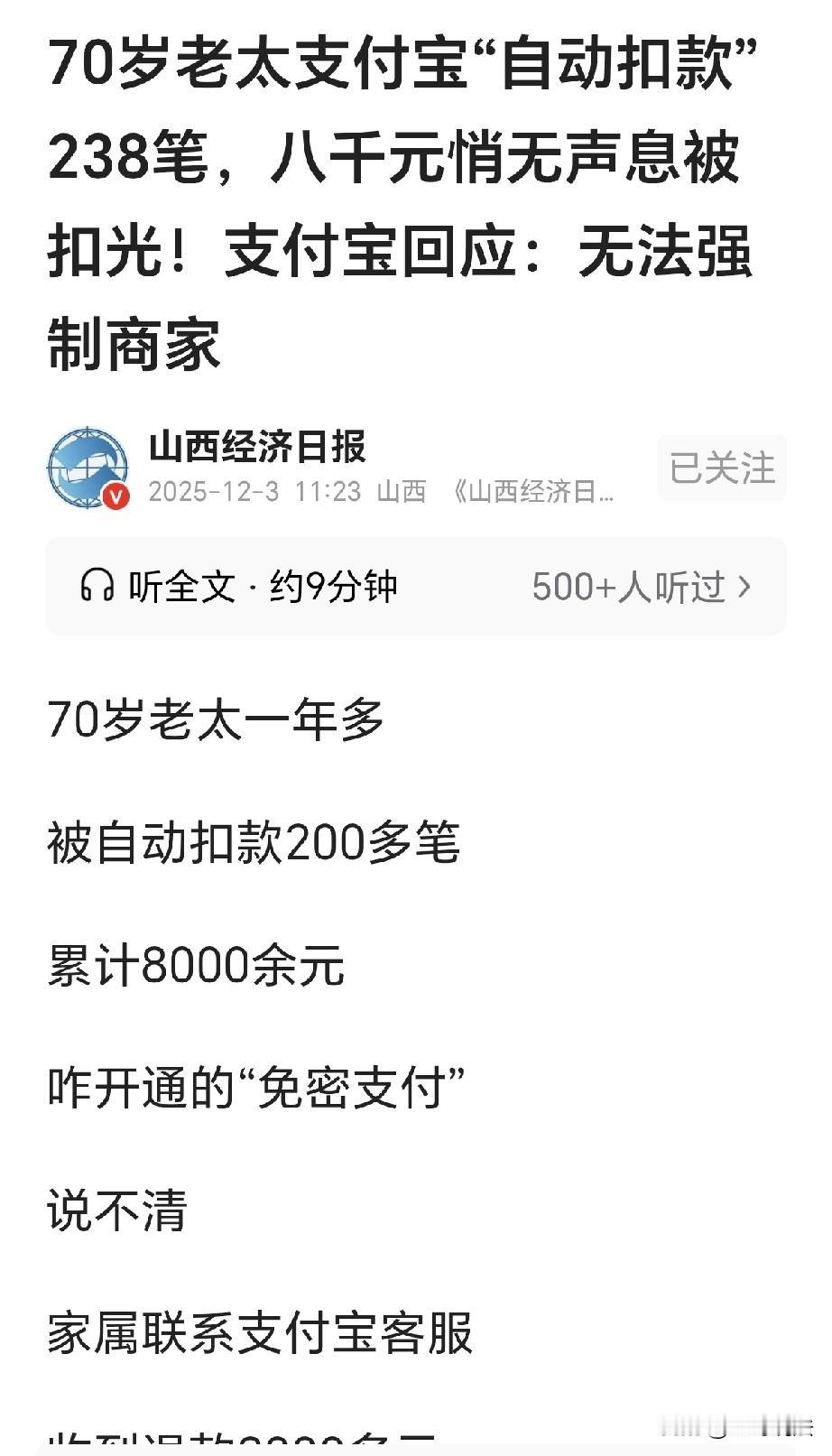 防不胜防!一男子发现,70岁母亲支F宝被扣走8237.09元,男子一查账单,共扣238笔元,最低扣款49.8元,最高扣1114.36元,扣款方有: VIP潮购计划味你而来,随心淘19.9,狂欢会员日,兔喜生活,奇淘惠等等20多家商户,每次扣款有19.9元、24.99元、29.9元、39.9元、48元、66元、79元、99元,男子急了,立刻找客服理论,客服: 无法强制让商家退费! 任先生的母亲已经70多岁,老太太时尚,她会上网,也会刷短视频。 为了让母亲高兴,任先生给母亲开通了支F宝,又在支付宝里充值了15000元。 任先生心想,有了这笔钱,母亲想要网购,那就十分的方便,平时生活缴费,也不用再到缴费地点。 从此以后,老太太畅游网络,玩的不亦乐乎,任先生也十分的高兴。 可是夏天的时候,任先生回来探望母亲,他偶然拿起母亲的手机,发现母亲支F宝被扣走了8000多元。 按道理来说,一年多的时间花了8千,这个数字并不算高,可据老太太所说,她并没有用过支F宝里的钱。 那这8000多元是花到了哪了?难道说这笔钱还会自己不翼而飞? 任先生一查账单,他大吃一惊,他发现母亲的支F宝在2023年12月被开通了自动扣款! 每月最低扣49.8元,最高扣1114.36元,一共扣了238笔,总计8237.09元。 而扣款方竟然高达20家,其中包括有: VIP潮购计划为你而来;随心淘19.9;畅享生活权益汇续费交易付款;VIP续费。 这还没完,还有狂欢会员日,兔喜生活,奇淘惠,飞🐷&支F宝生活出行包,生活权益尊享会员,任你换尊享会员19元,蓝业客服会员权益,热门短剧,哇塞生活卡等等商户。 任先生一看,头都大了,母亲糊涂,怎么就开通了这么多的扣费? 可母亲一脸懵圈,她啥也不知道,任先生又一看,各个商家的扣款金额都不一样,有19.9元,24.99元,29.9元,也有39.9元,48元,66元,79元和99元不等。 他看着这些明目,自己都搞不明白这是什么服务,母亲更是糊里糊涂,她不可能为这些去付费的。 任先生立刻将自动扣款关闭,从此以后就没出现过扣款了。 之后,任先生找支F宝客服,经过核实,支付宝退回来了2000多元。 但剩余部分至今未退,客服表示,他们无法强制商家给老人家退费。 任先生坐不住了,赶忙将支F宝里剩余的款项全部转了出来,以免后续再被扣走。 有人认为,支F平台有不可推卸的责任,三天两头弹出开通免密支付、🌸呗等,年轻人一不小心就中招,更何况是老年人,更是反应不过来。 还有人说,我关了老是又开了,我关了不下十次了,偶尔付款就会提示你开通,一不小心点快了就被默认开通了,真是个坑啊,我都关了很多次,老年人那里能知道这个呀。 之后记者拨打支F宝热线,客服表示,发生这样的情况,需要老人本人验证信息后,支付宝会督促商家退款,但无法强制商家退款。 客服还表示,家属也可以自己找商家协商退费。 记者又联系到3个商家,一家扣19.9元,一共扣了17次,因为时间已久,因此只给老人退还了12次。 另一家扣款66元,称可以给老人退款,但要等3 到5个工作日。 再有一家扣99元,商家告诉记者,要老人提供会员号就可以申请退款了。 有一位网友说她婆婆也有过这样的经历,婆婆78岁,在支F宝上被扣了3次短视频费用,不知道钱怎么出去的,反正老人就知道钱少了。 等我们回家时她就问我们,一看是短视频扣的,老人并没有看过这个付费的短视频。 估计就是刷视频的时候被链接引导就开始扣款了,之后第一次是找支付宝客服解决退回,第二次是同一个商家在一分钟内付款2笔,支付宝客服没有追回来,后来通过315平台投诉退回。 《消费者权益保护法》第八条规定: 消费者享有知悉其购买、使用的商品或者接受的服务的真实情况的权利。 有人认为,就应该取消免密支付的项目,它的坏处大大多于好处,如果真要使用服务,使用人并不会介意多操作几步用密码支付。 老人作为弱势群体,本来对现在这种收费项目、扣费规则就糊里糊涂,她们需要的服务有限,无非就是简单是看个视频或者单纯的购物。 可众多商家用模糊宣传、默认勾选等方式,使老人稀里糊涂就被扣除了费用。 平台应该加强监管,对商家采取有效措施,避免这种暗扣的事情再发生。
