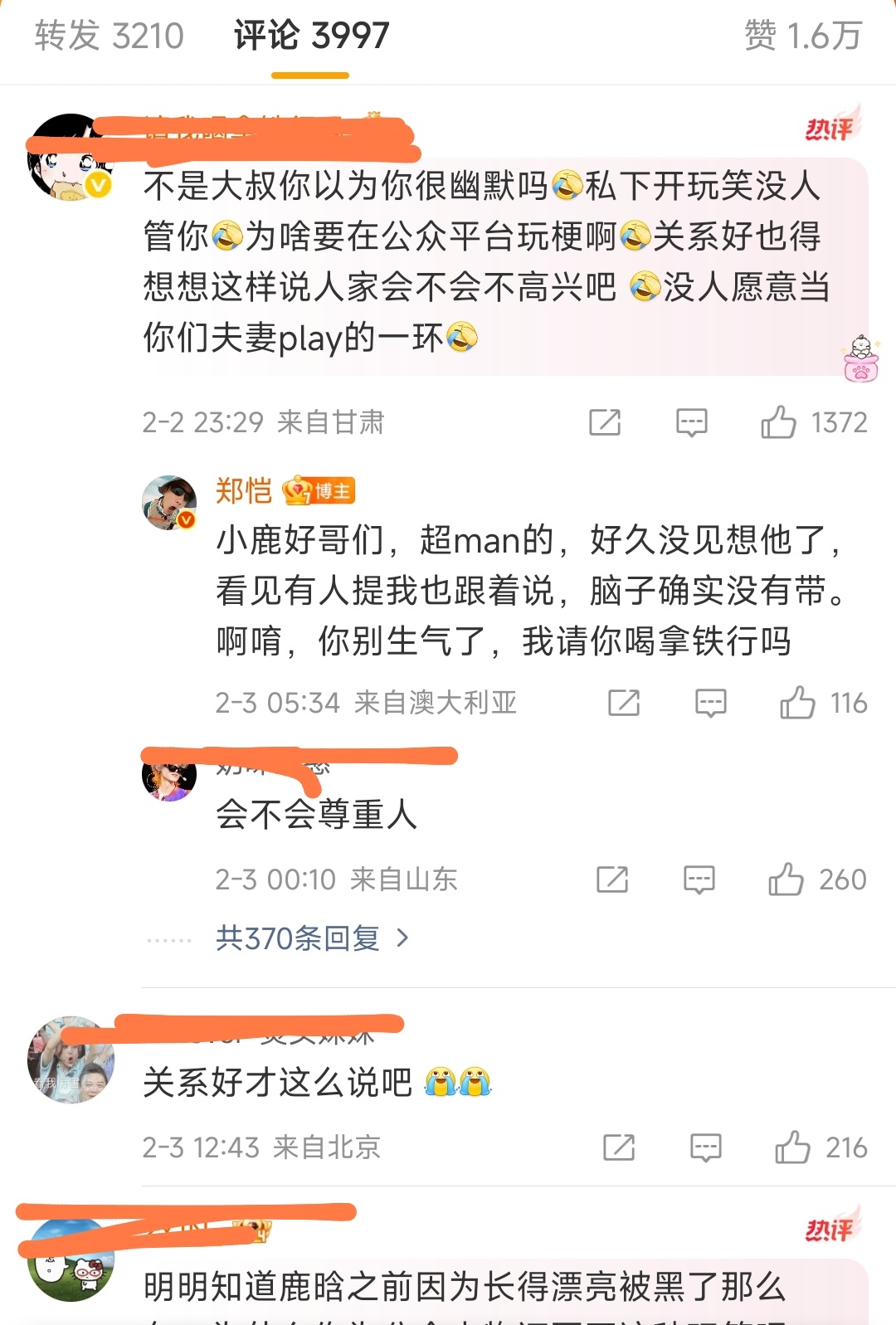 郑恺后续也立刻解释,是好久没见鹿晗想兄弟了,脑子没转过来才随口说的,还特意强调鹿晗超man,明显就是无心之失。说到底这就是好友间的一句调侃,既没恶意也谈不上不尊重。