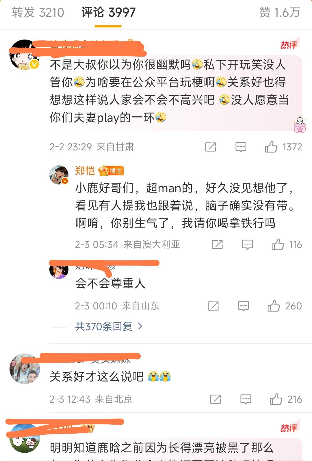 郑恺也是糟心了。 作为澳网观赛大使,开开心心带家人出游。 结果发了个网球视频时被网友问片尾模糊女性身影是谁,随口回了句“是鹿晗”。 然后就被揪着说不尊重人,上纲上线一顿骂。 熟悉两人的都知道,郑恺和鹿晗是多年好哥们,从跑男时期就交情深厚,熟人之间本就爱开这种随口的玩笑。 郑恺后续也立刻解释,是好久没见鹿晗想兄弟了,脑子没转过来才随口说的,还特意强调鹿晗超man,明显就是无心之失。 说到底这就是好友间的一句调侃,既没恶意也谈不上不尊重。 郑恺也及时做了说明,鹿晗那边也没任何不满的回应。 网友真没必要把这点小事无限放大,揪着一句话追着指责。 娱乐圈好友间的日常玩笑,理性看待就好,没必要太过较真。
