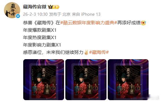 藏海传更新成绩恭喜肖战《藏海传》酷云再添好成绩年度爆款剧集、年度热度剧集、年度影响力剧集;藏海传剧王含金量持续上升!爆款剧,热度,影响力!口碑,热度,观众超爱的剧王藏海传!2025微博之夜爆款创作大赛