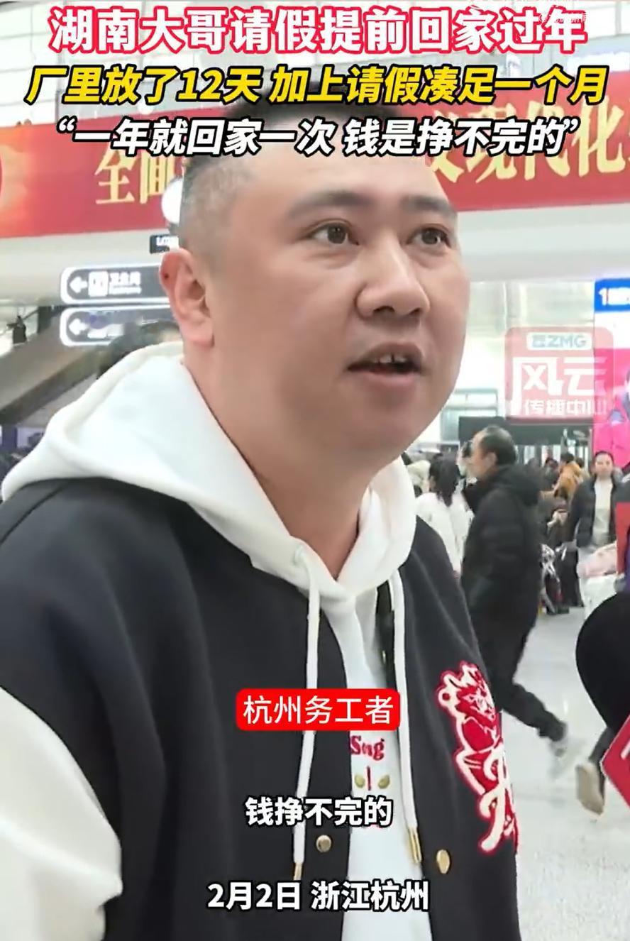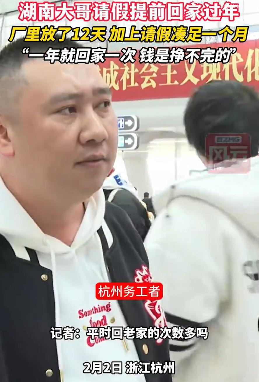 这是真清醒!浙江杭州,一男子提前请假回家,在火车站接受采访时,男子表示:就算没有年假,也要回家过年,钱是赚不完的!不过当问到平时能回几次家的时候,男子的回答却让人心酸 男子介绍,他的老家在湖南,现在在杭州一家厂里做工,今年和老婆两个人都在外打工,孩子留在老家让老人带着。厂里原本放假十二天,他特意请了假,凑足整整一个月,提前踏上了归途 他说,就算没有年假,也要回家过年,钱是赚不完的。说完这句话时,男子的脸上还面带笑容,而接下来记者问了句:平时回家的次数多吗? 男子一下严肃了起来,摇了摇头,直接回答说:不回!一年就回家一次 对此,有网友说:钱是挣不完,但是花得完啊 也有网友表示:我也请了一个月,领导还各种不开心,不开心也要回啊,在外一年图个啥,不就图个年底回家坐庄嘛 我们总说“回家过年”,可对很多人来说,这不仅仅是过节,更是一年中唯一能理直气壮放下工作、穿越千里、把手机放下、好好看看家人的时刻 我觉得,像这位大哥这种选择,很值得敬佩,人活一辈子,不可能只为挣钱而活。你拼命工作,赚到的钱或许能让你给家人更好的物质条件,可是如果无法享受与家人在一起的时光,那些钱又能给你带来什么呢?