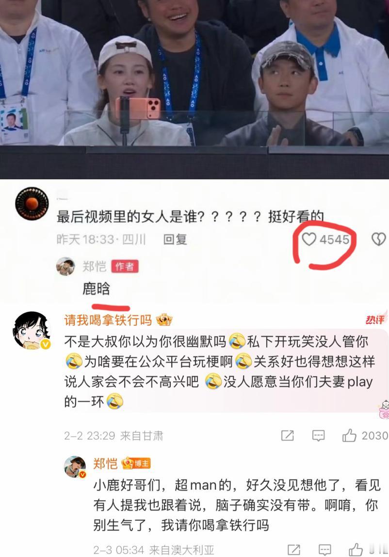 总感觉郑恺对苗苗有点“嫌弃” 就看他这个澳网volg,几十分钟视频,苗苗露面一秒钟 然后网友夸苗苗好看(高赞),正常逻辑不该是点赞或者回个秀恩爱的回复吗 结果他倒好,回了个“鹿晗”,一下子把那种秀恩爱的气氛破坏了。 看得出他对鹿晗应该没恶意,就是单纯不想在自己评论区提苗苗,想“玩梗”转移话题。 虽说他俩们两口子现在形影不离,资源也高度重合,但从各种路人偶遇视角看,郑恺的表情好像真不咋高兴。 以前觉得他们两口子挺恩爱的,但现在种种迹象,真的感觉这对夫妻很别扭,氛围怪怪的。