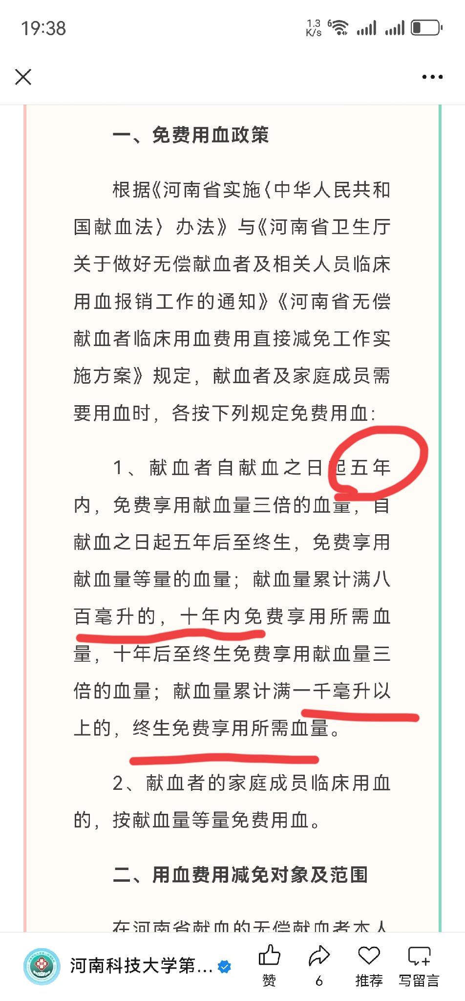 无偿献血冷知识 昨天看到我们这一家三甲医院发布的无偿献血人员报销用血费用的提醒,才知道原来无偿献血还有这么多冷知识,所谓的冷知识是我不知道或者没在意的事项,比如献血证,我就没有注意保存。 第一,报销费用的时候,需要献血证原件,注意哦,是原件。 没有见到实施细则,不知道原件丢失还能补不能,是不是必须补出来才行,手机上查到的献血记录承认不承认? 我一直以为这些都有据可查,特别是目前网络这么发达,献血记录都可以查询的到,比如我的 2800mL 的献血记录都能查到,但献血证保存的只有一两本。 第二,献血量有有效期。 有效期根据献血量不同而不一样。我献够 1000 了,就永久有效。800mL 以内 5 年效期,800—1000 的 10 年效期。 建议献够 1000mL,要不然过几年有需要的过期了就不划算了。