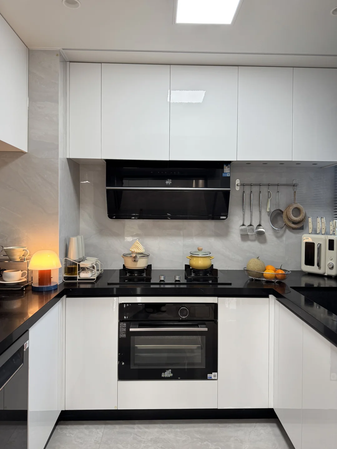厨房整体延续了黑白灰的主调,做了三联动推拉门,厨房面积不大,但布局规划得合理,一个人在厨房做饭也够用,但还是希望能有更大的厨房空间🍳