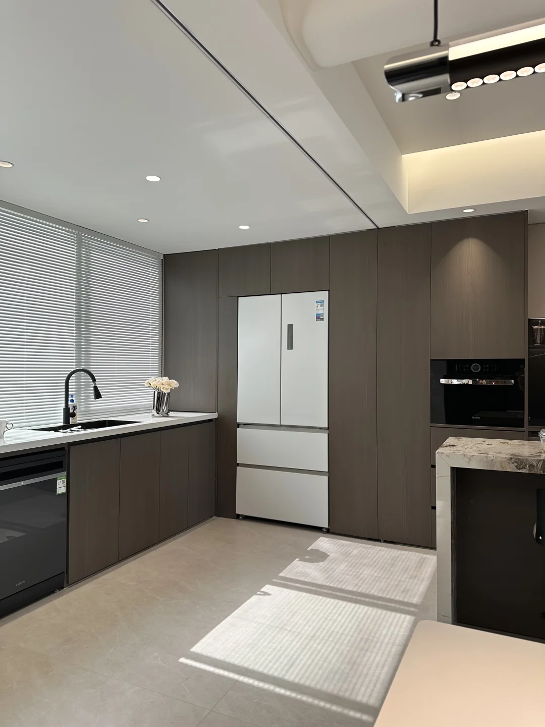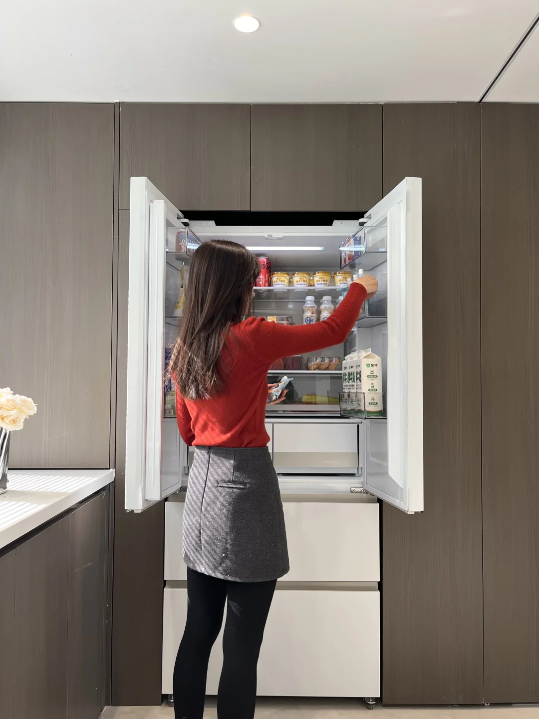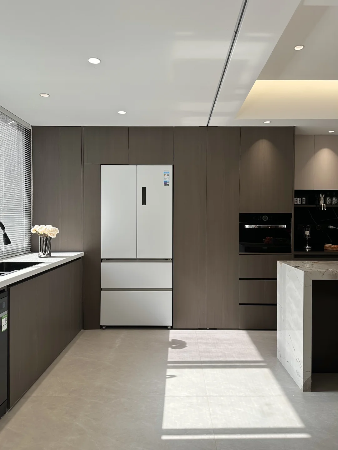 所以第二套房子的厨房做成了开放式。当时最花心思的就是冰箱放在哪里——怕太大了影响厨房的整体颜值。还好遇到了这台华凌神机518,瞬间成为了厨房的“安静担当”+“颜值加分项”。