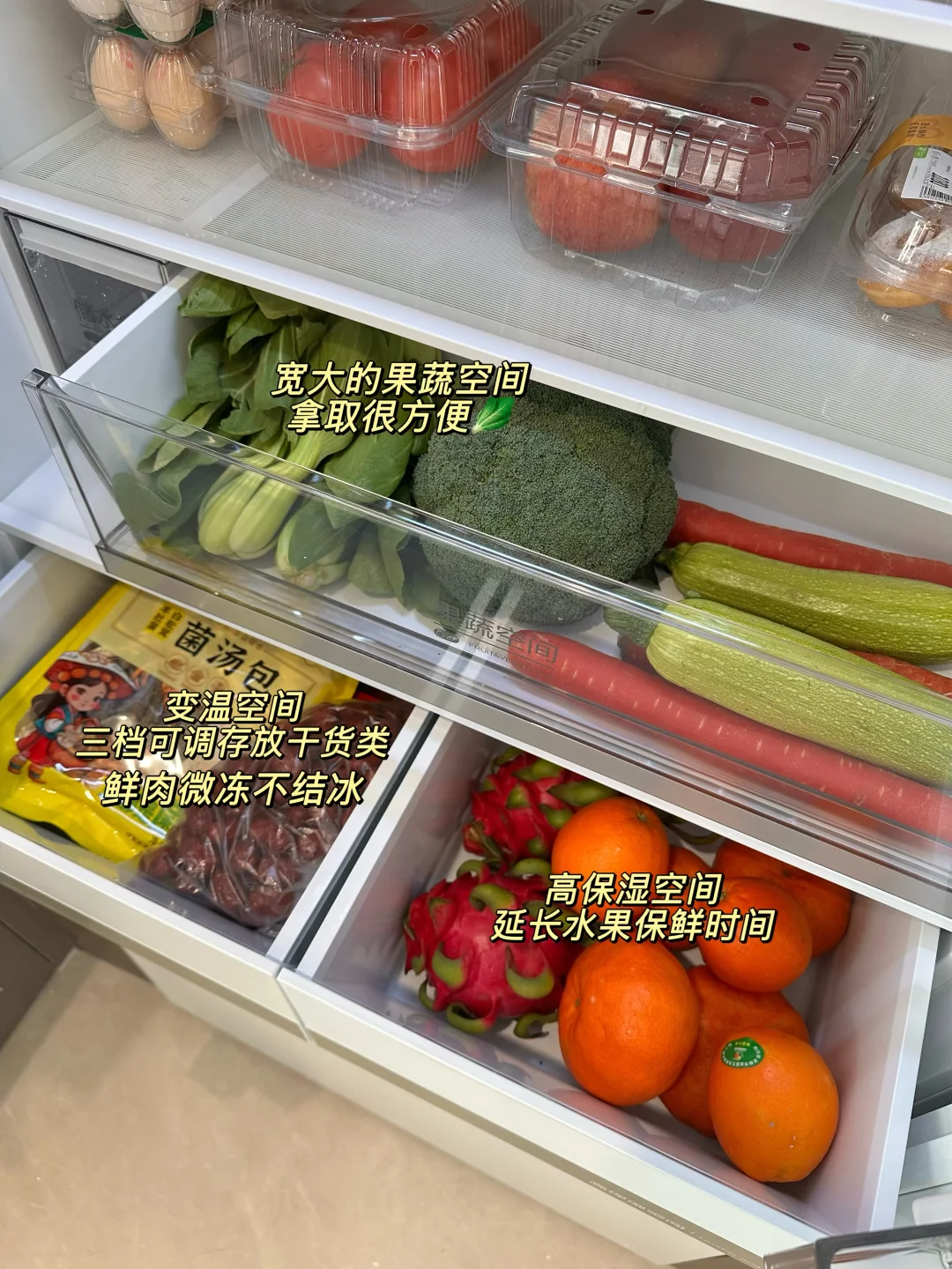 ⭐️我很喜欢它的高保湿空间。平常工作忙,我都是提前备好一周的菜,水果蔬菜放进去好几天拿出来都还是水水润润不容易蔫。