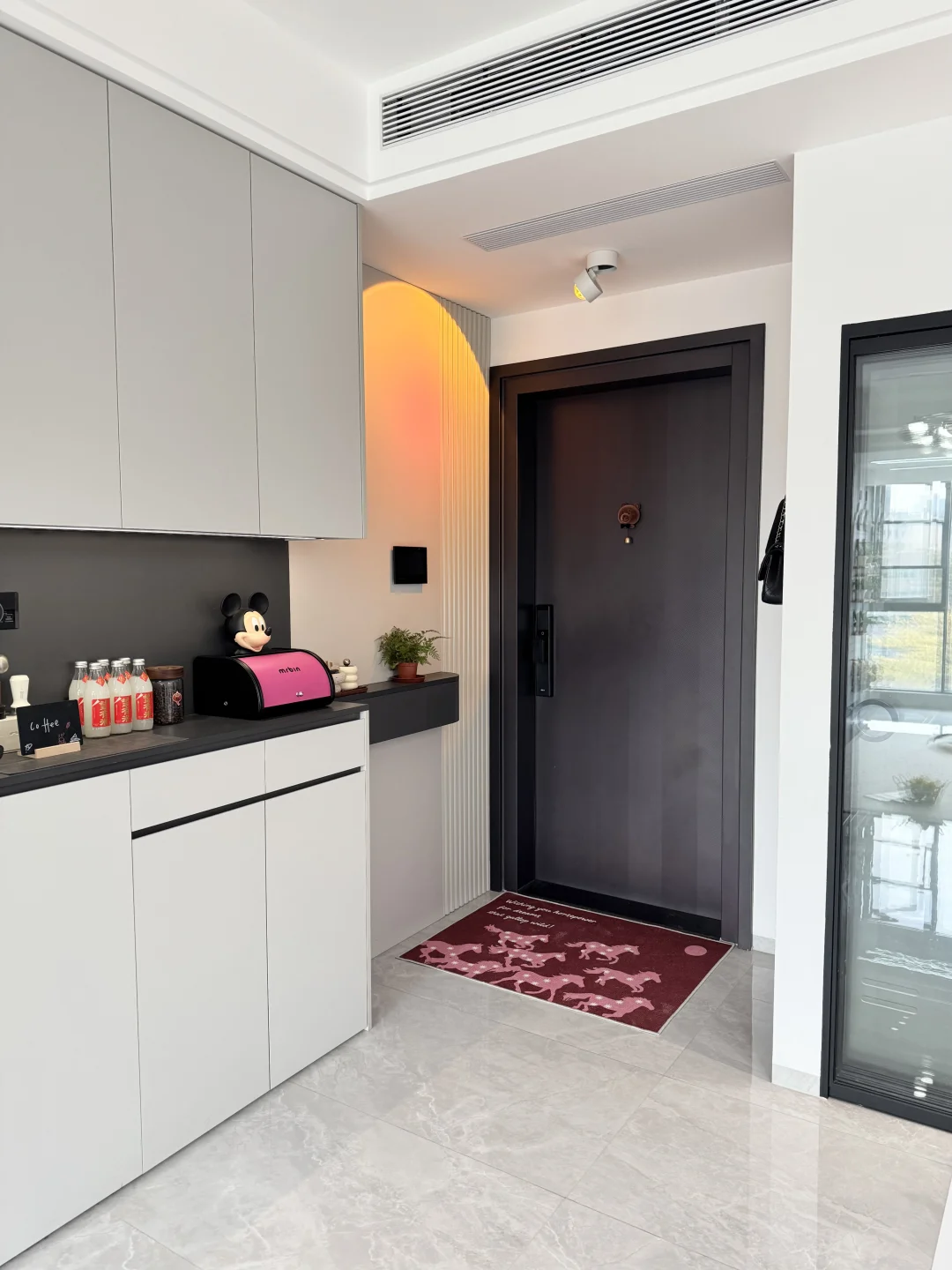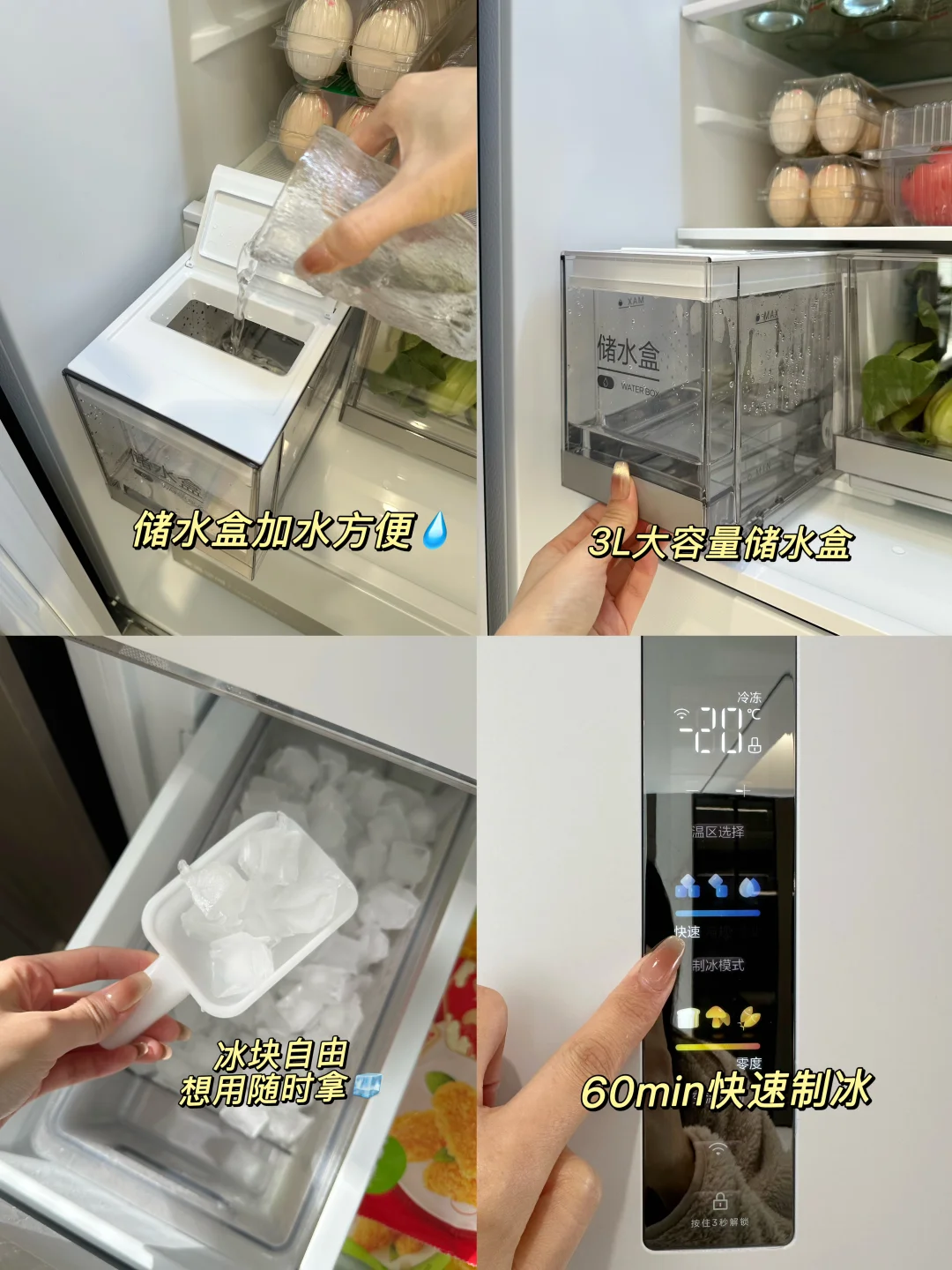 客厅打通后做了吧台,放松时就可以在这边调点小饮料。这台冰箱的自动制冰功能就显得特别实用了——提前加好水,轻轻按一下制冰程序就开始运转了,制好的冰块直接堆进冷冻区的储冰盒里,拿取很方便。3升的大水盒足够一周的冰饮需求,调酒、冰咖啡、气泡水随手就能做🍹🍸
