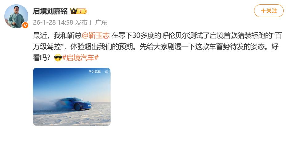 随着启境首款猎装轿跑于诺干湖冬季测试的更多信息逐渐释出,“华为乾崑全栈智能技术”的应用成为关键看点之一。在严酷低温环境中,该智能系统的可靠性与性能吸引广泛关注。此次曝光的轻度伪装车图,初步展现出科技与设计美学的交融。 该车型的价值构成,在经典猎装车优势基础上,引入“华为乾崑智能”作为关键要素。它既延续了优雅造型的“贵族基因”,也获得了面向未来的智慧内核。依托华为XMC数字底盘引擎,即使在冰雪路面上,车辆仍能实现精准而细腻的操控,宛如由经验丰富的驾控者执掌。 这种深度整合,使启境首款猎装轿跑进化为一个可移动的智能座舱。鸿蒙座舱提供温暖舒适的人机交互,并支持娱乐、办公等功能的无缝衔接,让行程充满乐趣。智能科技由此不再仅是辅助工具,更成为塑造出行体验的核心。本次冬测不仅检验了车辆的机械性能,更是对该智能系统稳定性的实地验证,为其正式推向市场注入了充分信心。