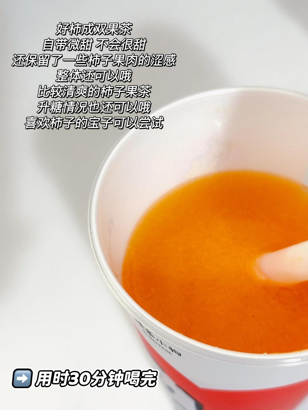 好柿成双果茶,自带微甜,不会很甜,还保留了一些柿子果肉的涩感,整体还可以哦,比较清爽的柿子果茶〰️升糖情况也还可以哦,喜欢柿子的宝子可以尝试🫶🏻