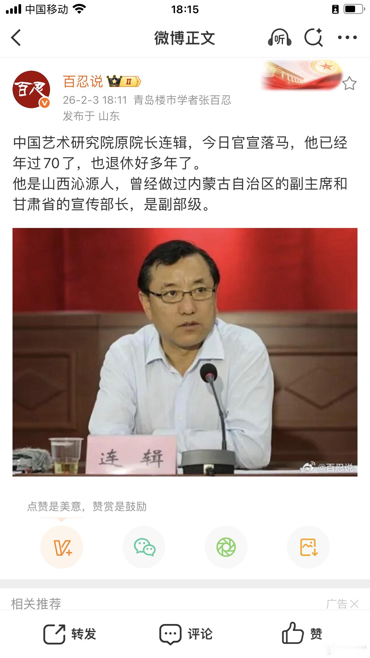 内蒙古自治区政府原副主席连辑官宣落马。两年前, 非遗保护中心主任王福州、协会原会